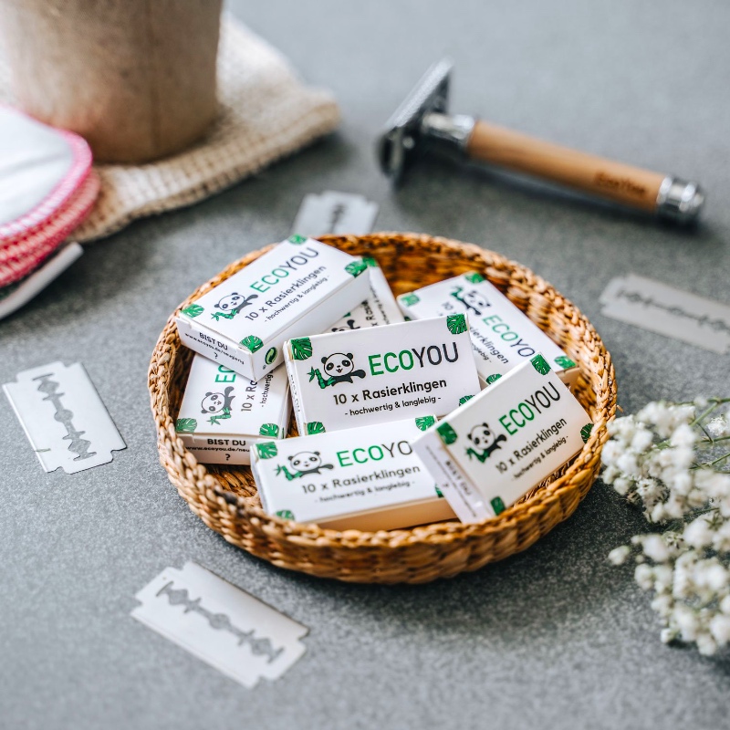 Die Rasierklingen von EcoYou kommen in einer plastikfreien Verpackung. Die Ersatzklingen sind in einer handlichen Papierverpackungen verpackt und auch jede Rasierklinge ist aus Sicherheitsgründen ebenfalls in Papier gewickelt.
