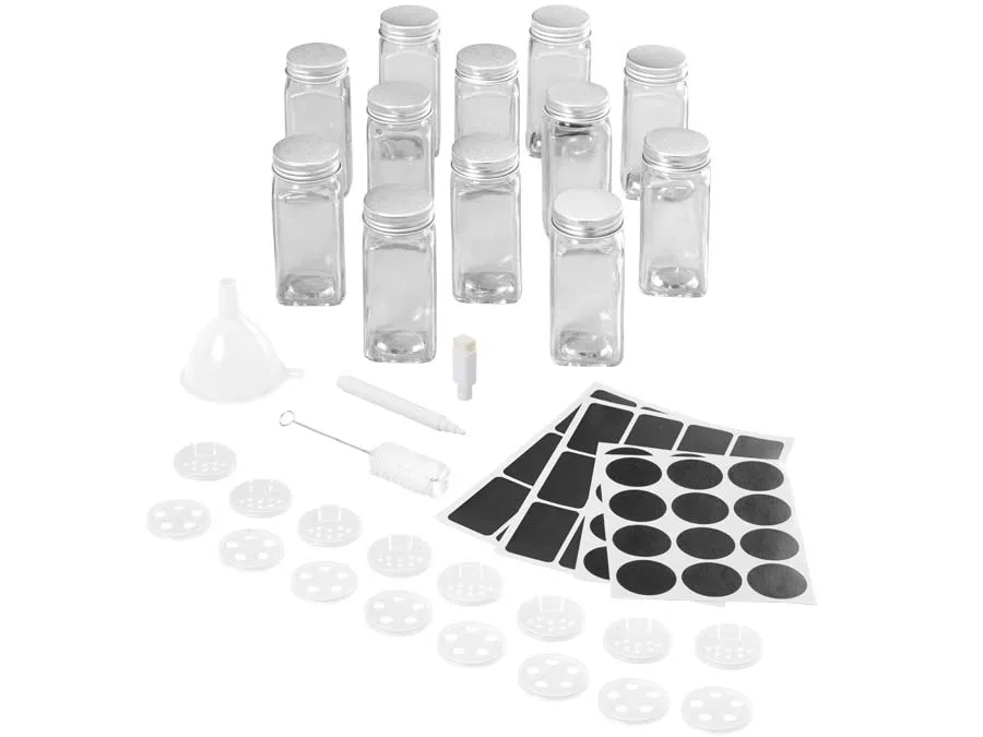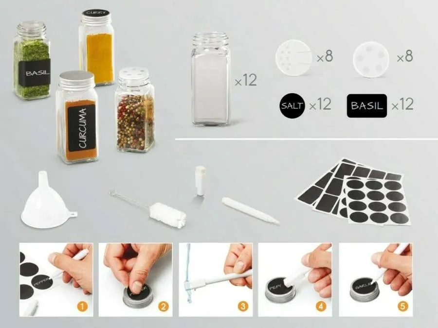 Sorgfältig beschriftete Gewürzstreuer im einheitlichen Design sehen nicht nur schön aus, sondern helfen dir, beim Kochen Zeit zu sparen und den Überblick zu behalten.