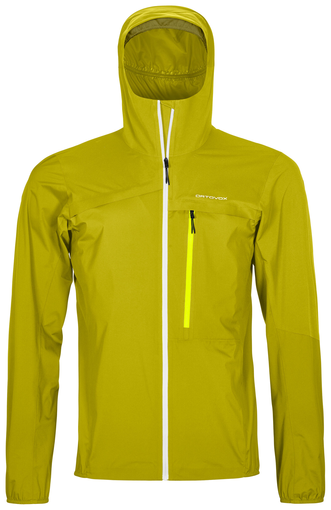 Zudem ist die hochfunktionale Regenjacke mit einer selbstregulierenden Kapuze ausgestattet. Ein umlaufendes Gummiband und ein verstärkter Schirm sorgen für optimalen Sitz bei Regen und Wind. Dezente MERINO COOL Einsätze erhöhen gleichzeitig den Tragekomfort im Kinn- und Stirnbereich. Die elastischen Ärmelabschlüsse sowie der elastische Saum verhindern ungewolltes Eindringen von Wind und Nässe. Genügend Stauraum für Karte, Topo, Riegel oder Handy bleibt nach wie vor in der Brusttasche.