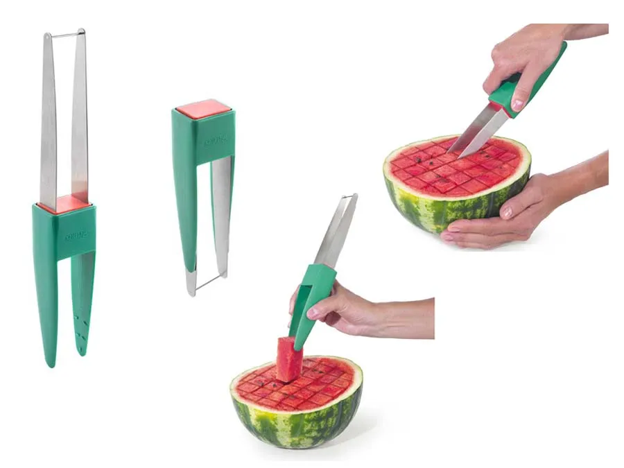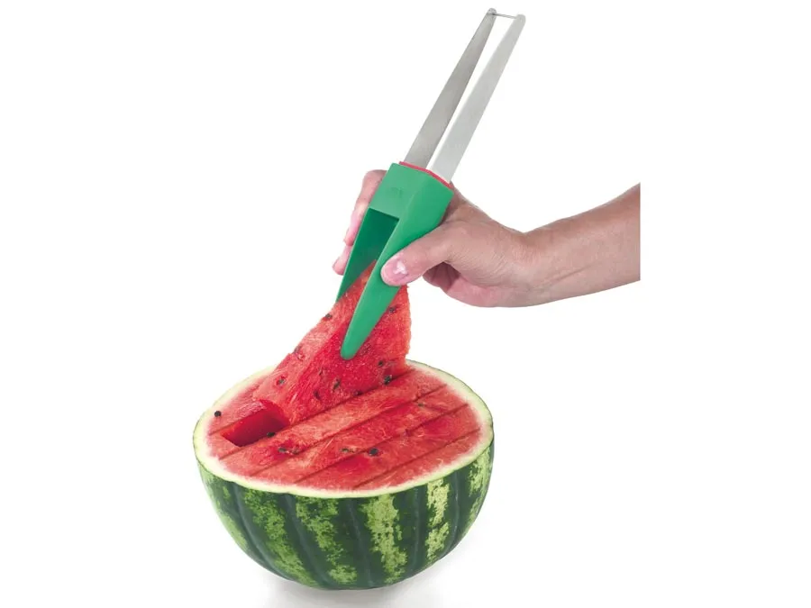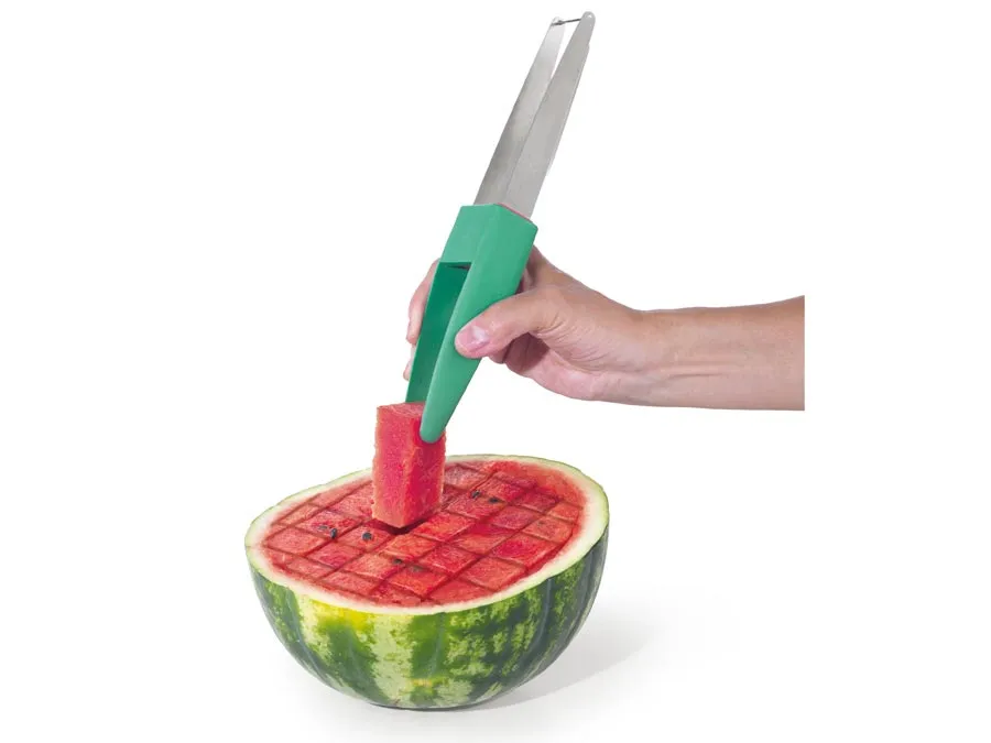 Der Melonenschneider mit dem netten Namen „Sir W. Melon“ vereinfacht das Schneiden von Scheiben oder Würfeln extrem. Die Wasser-/Melone muss einfach nur mit einem großen Messer halbiert werden, den Rest erledigt der Melonenschneider: der ca. 2,7 cm breite Edelstahl-Draht schneidet butterweich durch das Fruchtfleisch der halbierten Melone. So entstehen schon mal Streifen bzw. Scheiben. Zum würfeln machst du das gleiche einfach in der anderen Richtung, um 90° gedreht.[/vc_column_text][/vc_column][/vc_row][vc_row][vc_column width=“2/3″][vc_column_text woodmart_inline=“no“ text_larger=“no“]Um die einzelnen Stücke aus der Melonenschale herauszuheben, drehst du den Melonenschneider einfach um: Der Griff wird zur Servierzange, mit der du die Melonenstücke ganz einfach greifen kannst. Eine saubere Sache!