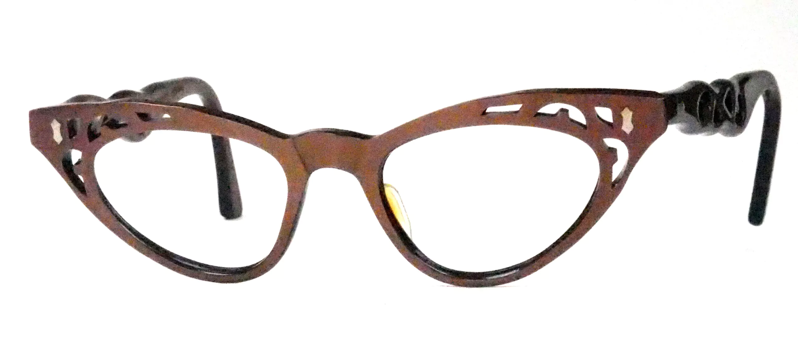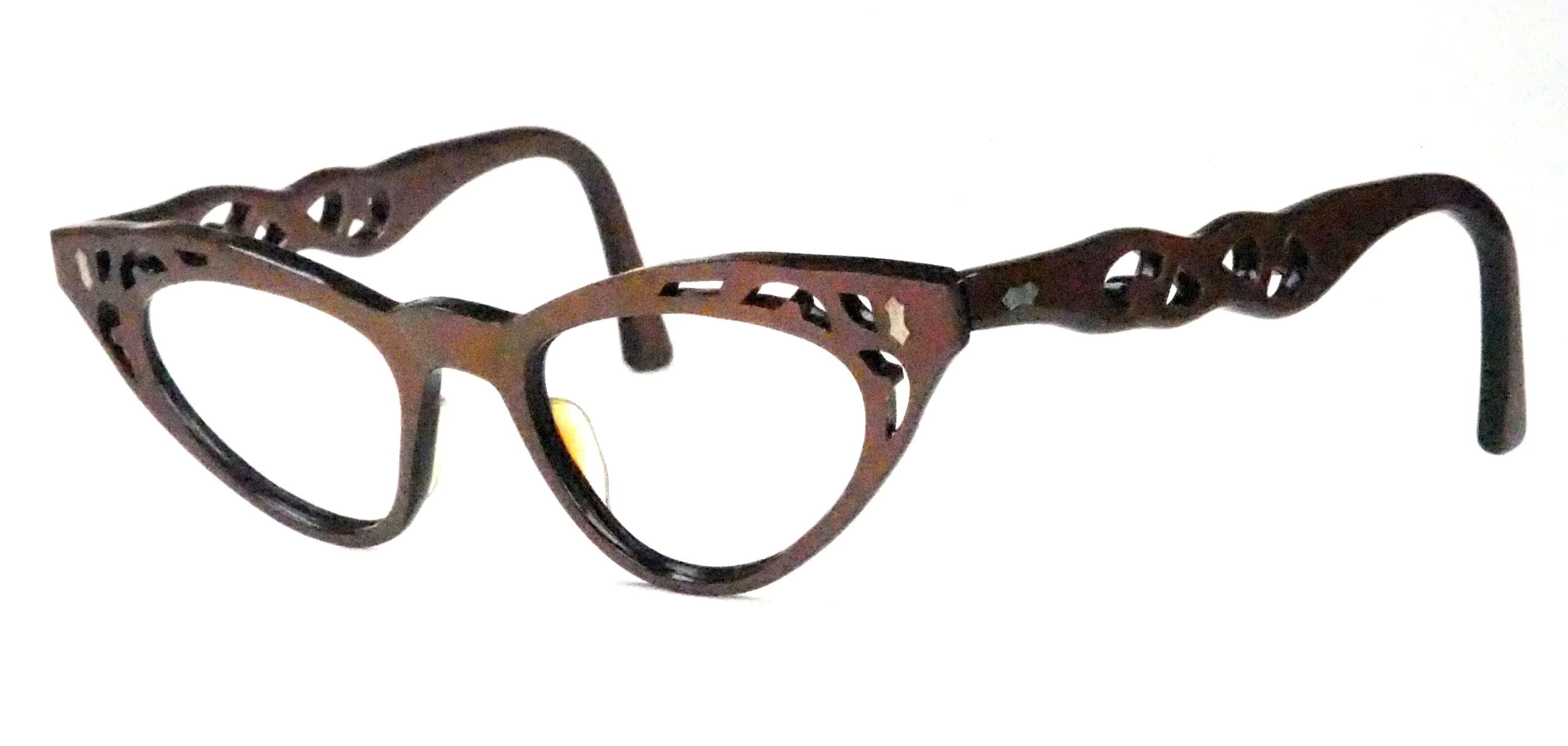 Echte Cateyebrille, Rockabillybrille aus den 50er Jahren. Noch fabrikneu im Top-Zustand. Moccavelvet mit dezentem Duchbruchmuster.