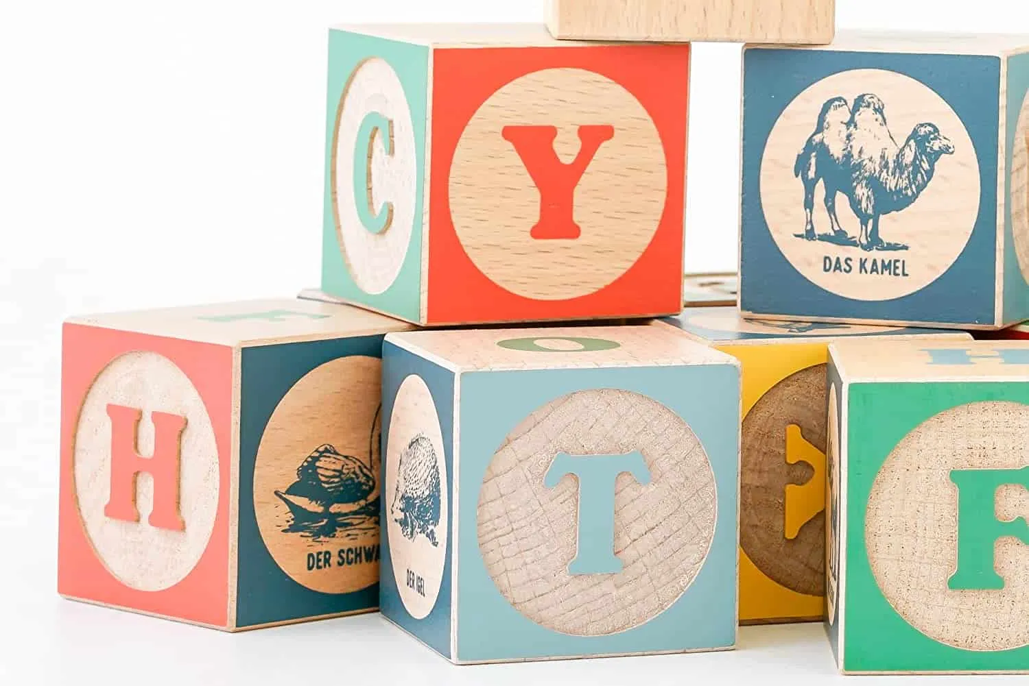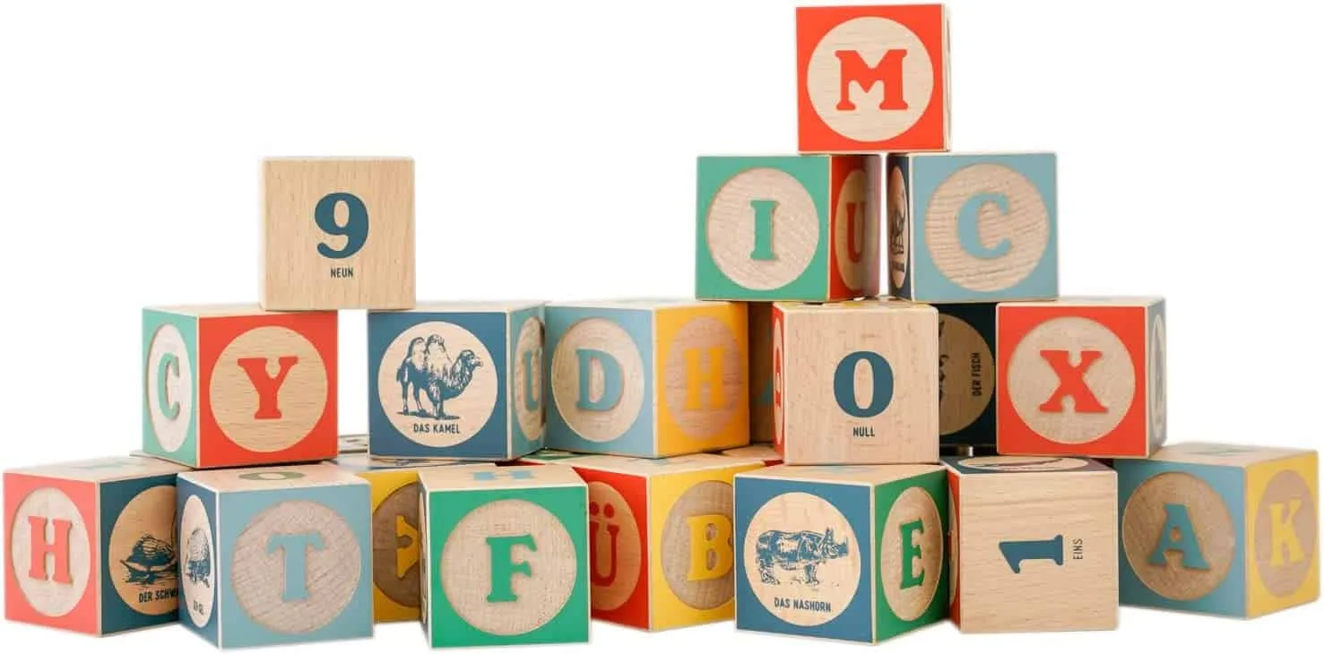 Die Namen der Tiere und Zahlen in diesem Set sind in deutscher Sprache geschrieben. Diese klassischen ABC-Bausteine aus Holz werden mit einer praktischen Stofftasche geliefert, in der die Bausteine nach dem Spielen aufbewahrt werden können.
