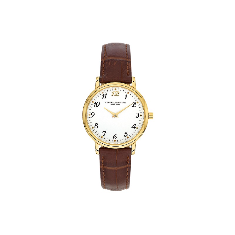 Im goldglänzenden Edelstahl-Design schmückt diese hochwertig verarbeitete Abeler & Söhne Uhr Ihr Handgelenk. Die klassische Damenuhr ist 3 bar wasserdicht und ausgestattet mit einem schlicht weißen Zifferblatt, bei dem besonders die gelbe Zwölf in den Fokus rückt. Durch die goldfarbenen Zeiger in Dauphine-Form wird das gut ablesbare Zifferblatt stilvoll ergänzt. Ein geprägtes Lederband in Dunkelbraun und ein kratzfestes Saphirglas vervollständigen die Qualitätsmerkmale dieses Klassikers, der zudem mit einem Swiss Made Quarz-Werk von Ronda ausgestattet ist. Eine schlichte, leicht ablesbare Uhr, die Sie wunderbar mit Ihrem Lieblingsschmuck kombinieren können.