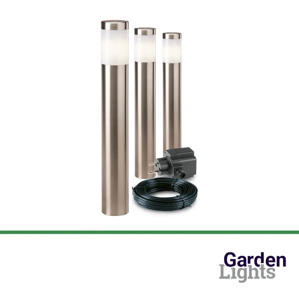 Set bestehend aus 3 Sockelleuchten, einem 8 Meter langen Hauptkabel und einem 21-W-Transformator. Die Leuchte verfügt über einen Zylinder mit 24 LEDs und einem Verbrauch von 2 Watt. Das Albus Set besteht aus drei Leuchten, einem Hauptkabel und einem Transformator. Eine Leuchte mit klarem Design, gefertigt aus Edelstahl und Kunststoff. Albus ist eine schöne, moderne Sockelleuchte mit den Maßen 410 x 60 mm (HxB). Die 12-Volt-Beleuchtung kann mit anderen Garden Lights Leuchten verbunden werden.