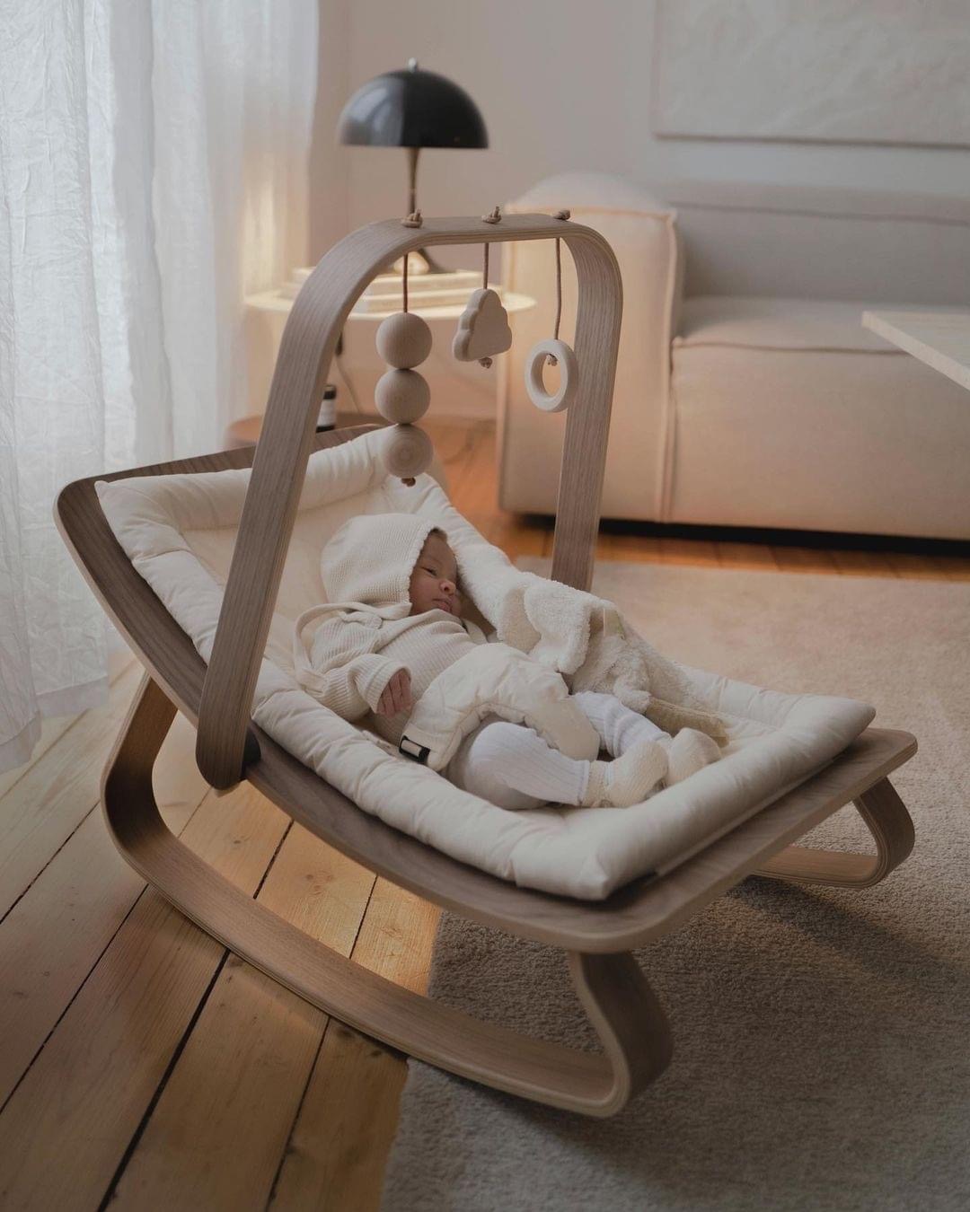 Der Baby-Turnbogen mit Holzspielzeug wurde für die LEVO Baby Wippe entworfen und ist ideal, um das Kind von Geburt an zu stimulieren. Die natürlichen Holzspielzeuge — Wolke, Ring und Holzperlen — sorgen für sanfte Stimulation und Unterhaltung für das Baby in seinem LEVO.