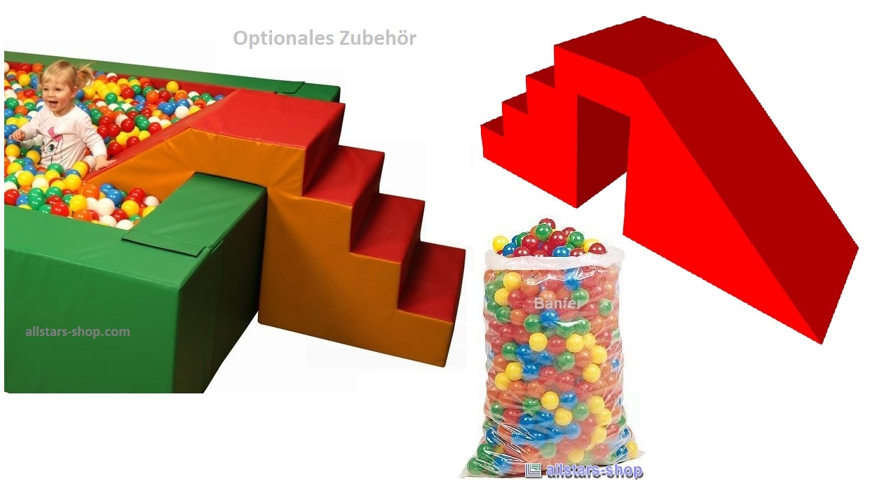 Das Schaumstoff-Ballbad „Rechteck Maxi“, vierteilig, gehört zu den beliebten Großbauklötzen für Kindergärten, auch kleineren Spielräumen jeglicher Art und Spielräumen in Einkaufsmärkten. Diese stabilen Schaumstoff-Bauelemente haben einen strapazierfähigen Kunstlederbezug, standardmäßig in den Farben grün und rot. Vier „robuste“ Bausteine mit einer Kantenlänge von 2.250 x 2.250 x 500 mm sorgen für einen Spielspaß pur. Das Rechteck-Ballbad Viereck Maxi ist ideal für Orte mit nicht so viel Platz. Eine zusätzliche, verstellbare Treppenpenrutsche – ist gegen Aufpreis bei uns zu erwerben.