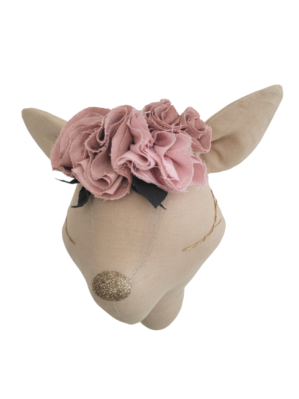 Dieses handgemachte Reh hat wunderschöne Blumen auf dem Kopf. Einfach mit einer Schnur, die an der Rückseite befestigt ist, an der Wand aufzuhängen.