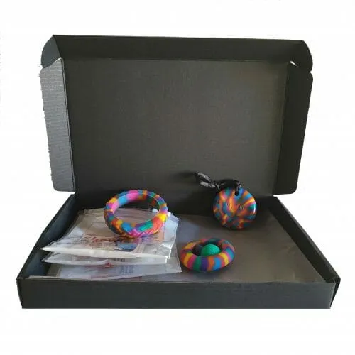 De box wordt geleverd met een kauwketting, kauwarmband en een friemel-kauwproduct. De produkten worden geleverd in een zwart doosje.