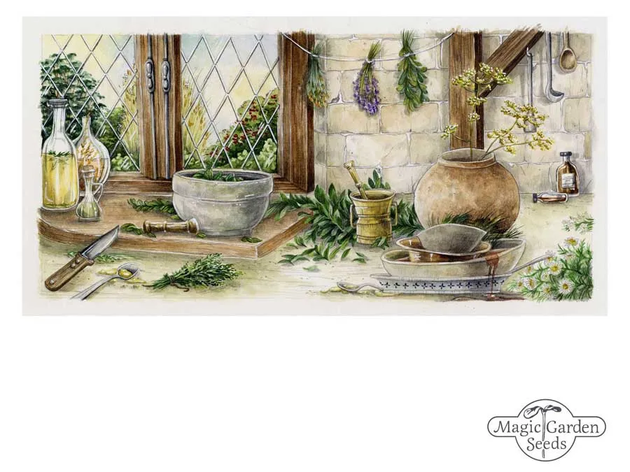 Das detailreich gezeichnete Postkarten-Motiv „Heilendes“ zeigt eine Arbeitsfläche voll mit Utensielien zur Herstellung von Naturheilmitteln. An den Wänden hängen Kräuterbüschel , angesetzte Tinkturen und Auszüge warten auf ihren Einsatz. Das Fenster geht zum Garten hinaus.