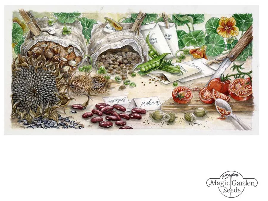 Das detailreich gezeichnete Postkarten-Motiv „Saatgut“ zeigt einen Tisch voller verschiedener Samen: Tomaten, Mohn, Bohnen und viele mehr. Hättest du die Sorten auch ohne Beschriftung erkannt?