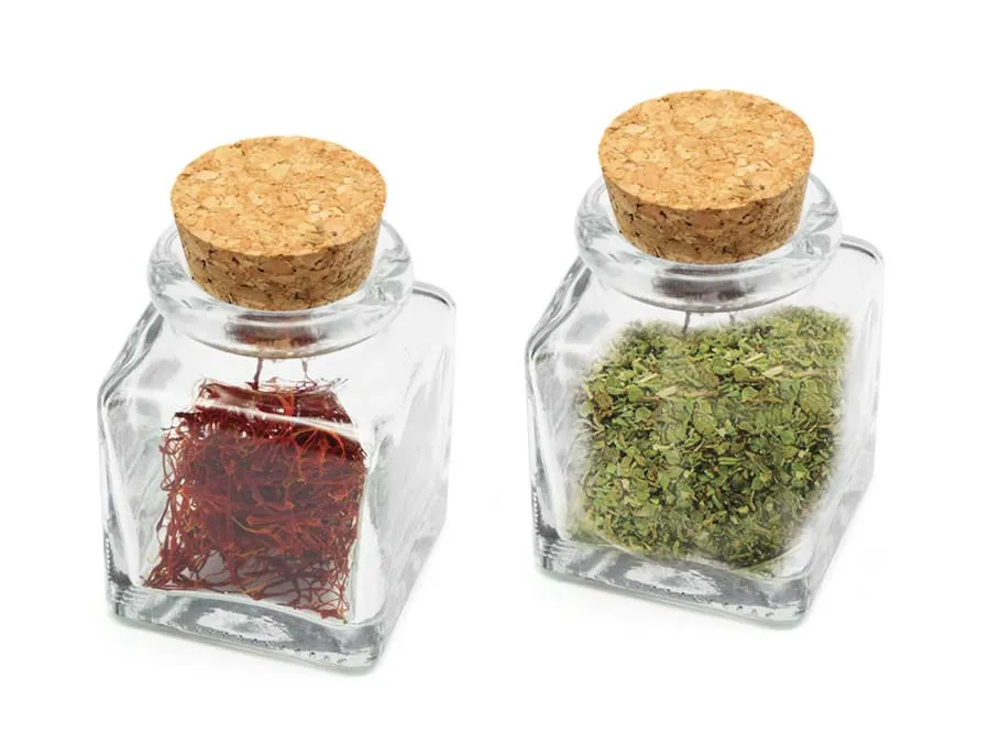 Der Deckel aus Naturkork verschließt das Glas luftdicht. Mit seiner kompakten Größe findet es in jedem Kräuterschrank und -regal Platz.