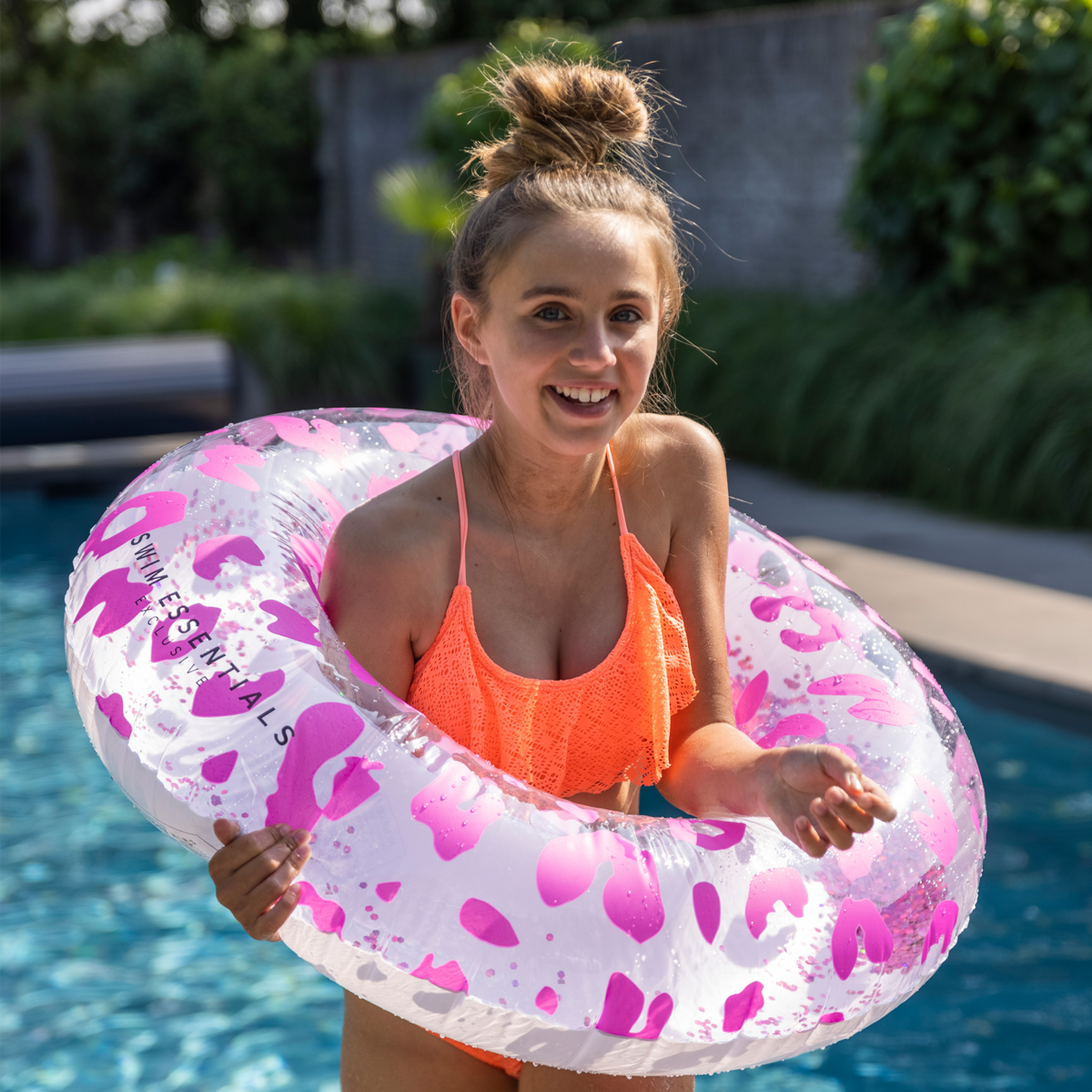 Mit dem Swim Essentials Schwimmband mit neonfarbenem Panther-Print wirst du diesen Sommer im Pool glänzen! Der aufblasbare Poolring sorgt dafür, dass Sie den ganzen Sommer über im Pool entspannen können. Der Swim Essentials Schwimmring mit Panther-Print ist für Mädchen über 6 Jahre mit einem Maximalgewicht von 80 kg geeignet. Der Swim Essentials-Pool hat einen Durchmesser von 90 cm und mit dem einzigartigen Swim Essentials-Stil, den der Schwimmring hat, können Sie das Wasser in vollen Zügen genießen und darin schwimmen. Der neonfarbene Panther-Print in Kombination mit der transparenten Oberseite und dem einzigartigen Swim Essentials-Design des Schwimmrings sorgen für einen schönen Look auf dem Wasser. Der aufblasbare Schwimmring lässt sich auch perfekt mit der Luxus-Luftmatratze Neon Panther Print kombinieren. Glänzen Sie mit dem Swim Essentials Schwimmring mit Neon-Panther-Print durch den Sommer!