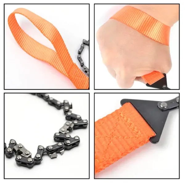 Die THREO-Taschenkettensäge besteht aus haltbarem Kohlenstoffstahl mit superstarken Nylongriffen mit festen Nähten. Dieses wärmebehandelte Material reduziert das Binden beim Schneiden. Dank der Griffe lässt sich unser Werkzeug leicht greifen und halten, ohne dass man sich die Hände einschneidet oder Blasen bekommt. Ihr erweiterter Durchmesser schafft außerdem genügend Platz für Schutzhandschuhe.