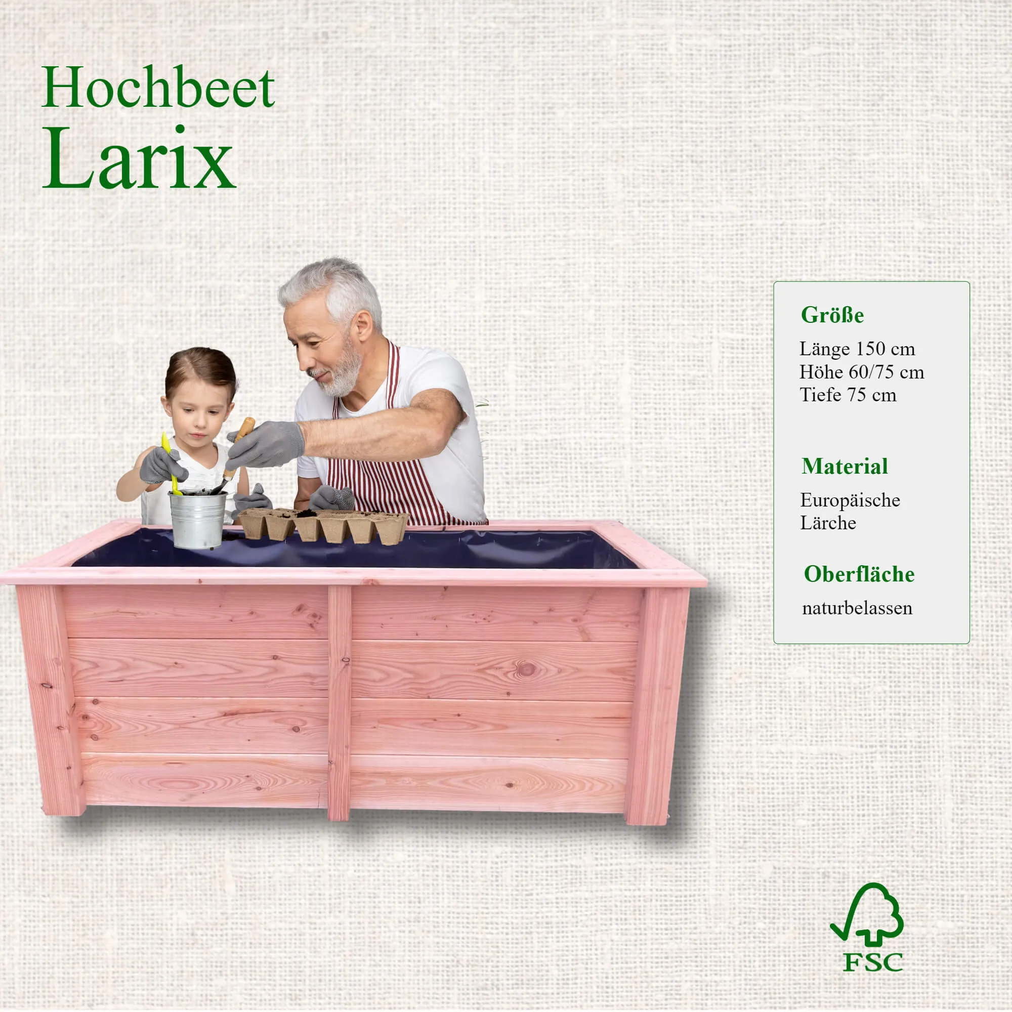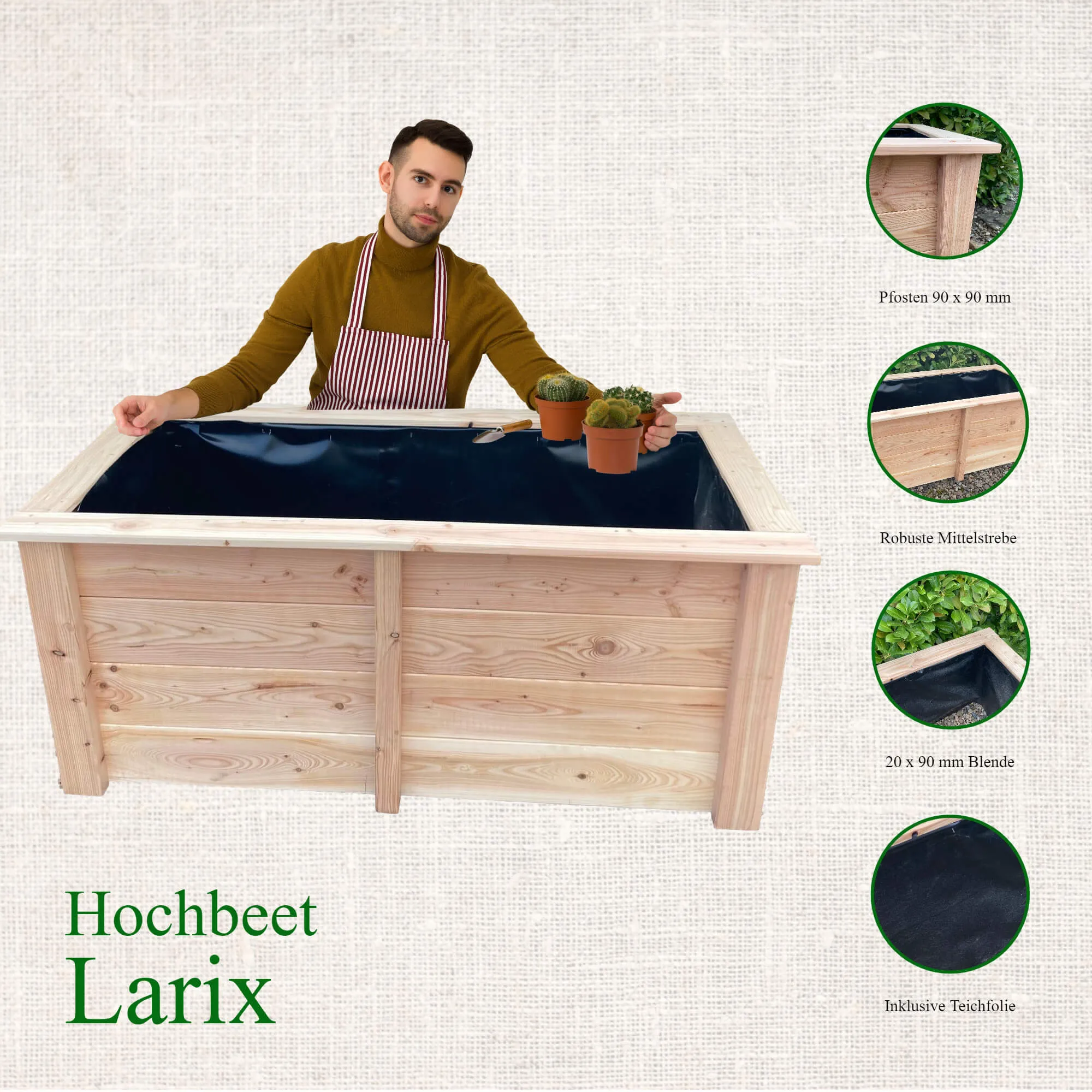 Das massive Hochbeet Larix hat eine rückenschonende Höhe. Der Bausatz aus unbehandeltem Lärchenholz ist aus massiven 20 mm Bohlen gefertigt und sollte nachträglich mit einem geeignetem Holzschutzmittel behandelt werden.
