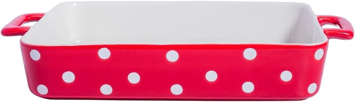 Entdecken Sie die zauberhafte Isabelle Rose Auflaufform groß aus hochwertiger Keramik, verziert mit bezaubernden weißen Polka Dots! Diese DU-förmige Auflaufform ist nicht nur ein praktisches Küchenutensil, sondern auch ein echter Blickfang auf Ihrem Esstisch.