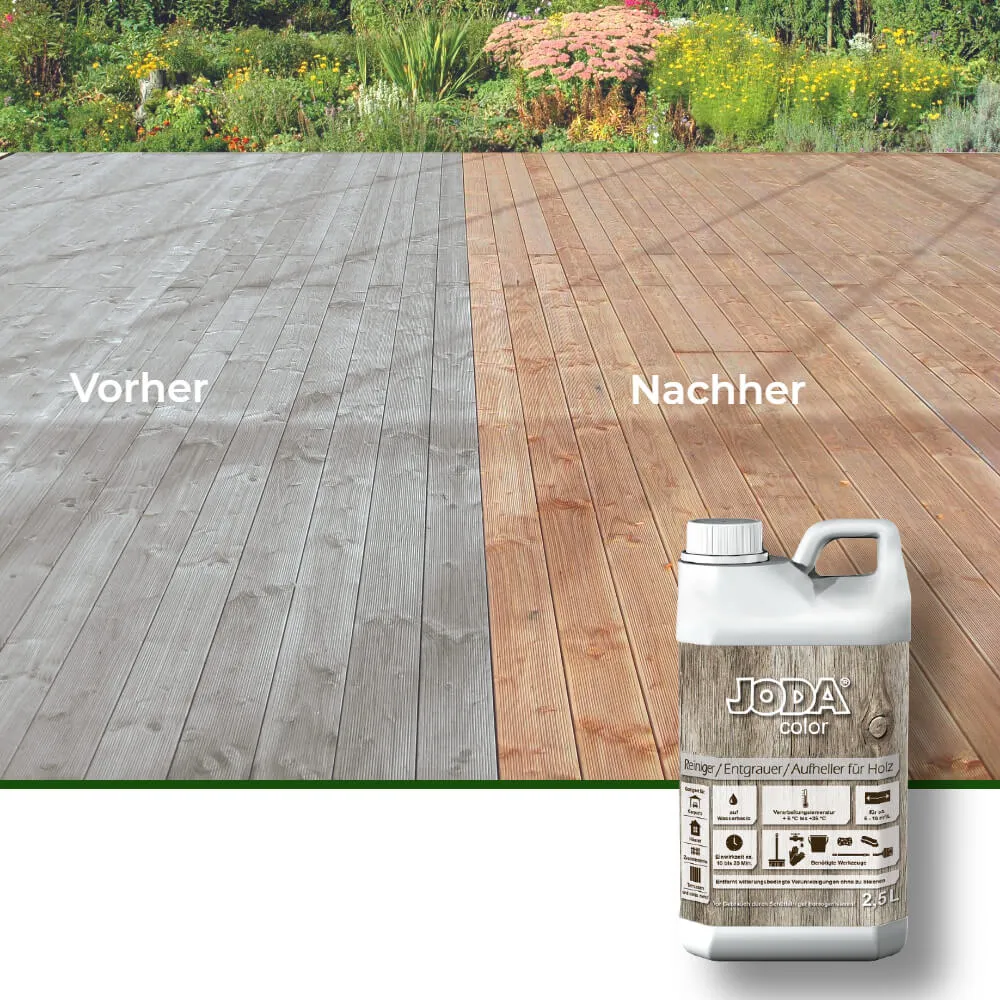 Reinigt porentief, indem es in den Untergrund eindringt.Vergraute Holzuntergründe, auch druckimprägnierte Hölzer oder Harthölzer werden aufgehellt. Reinigt effektiv, ohne die behandelten Oberflächen zu schädigen oder zu bleichen.