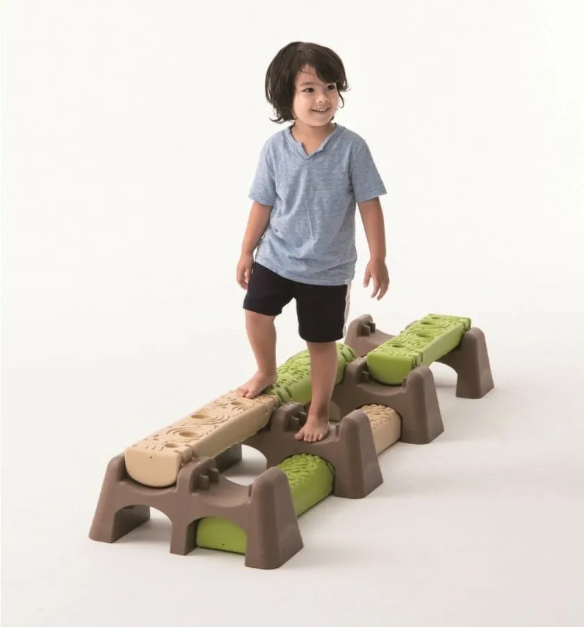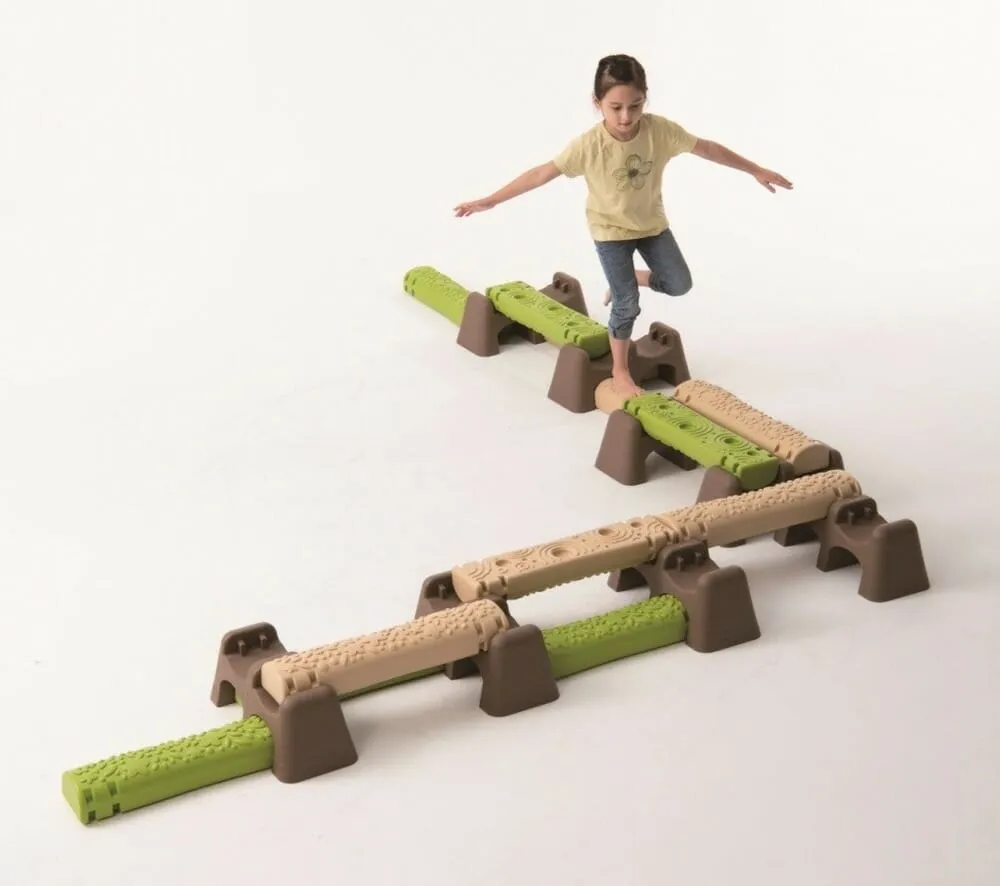 1. ‚Jungle Trial‘ is geïnspireerd op een bospad. De boomstammen zijn aan de ene kant vlak en convex aan de andere kant, wat kinderen verschillende uitdagingen zou kunnen bieden tijdens het lopen.