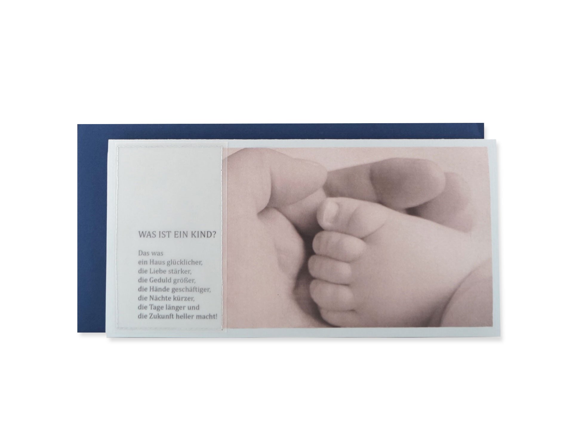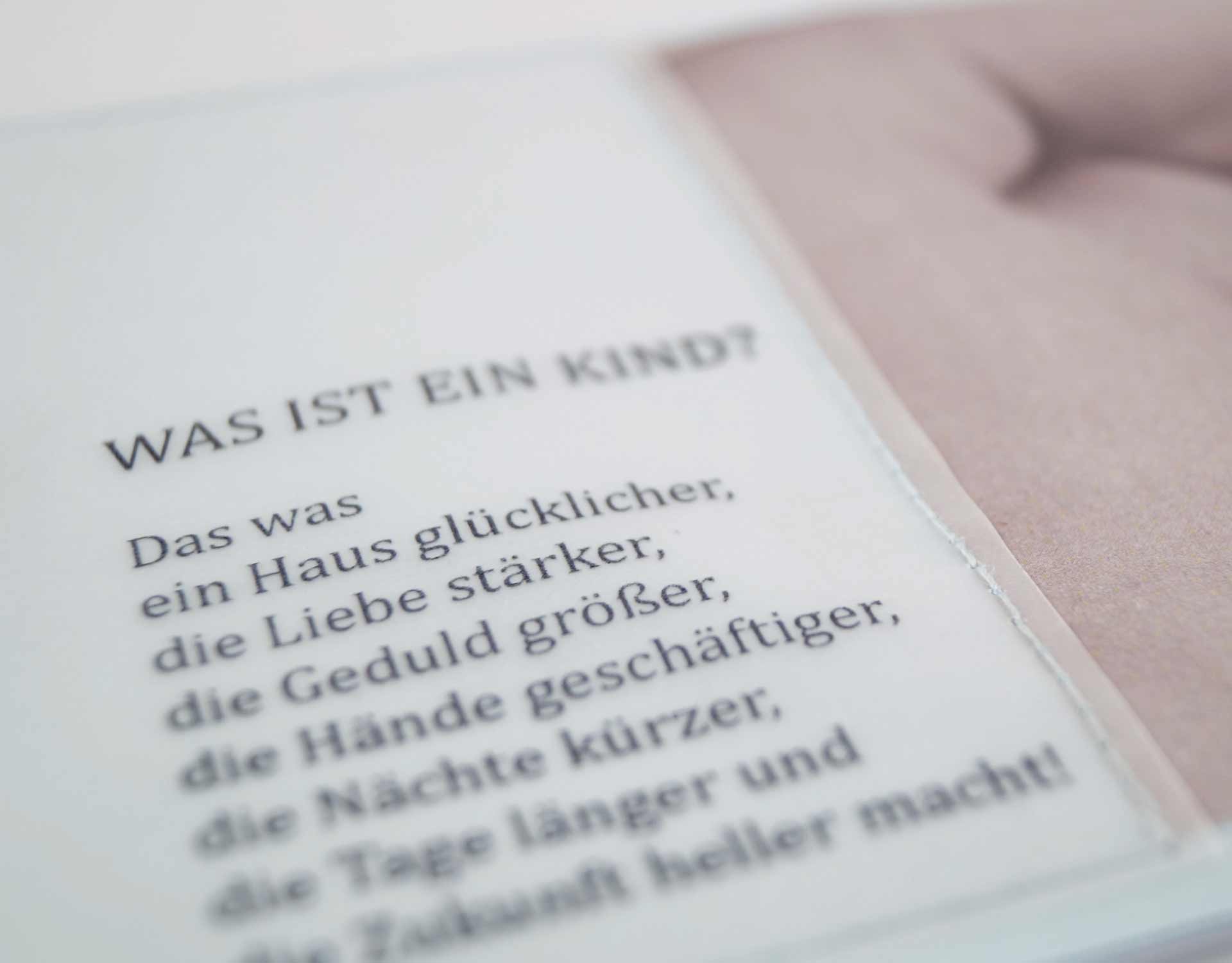 Die Karte lässt innen Platz für persönliche Glückwünsche. Auf der Außenseite ist ein Foto mit Transparentpapier übernäht und folgender Spruch abgebildet: