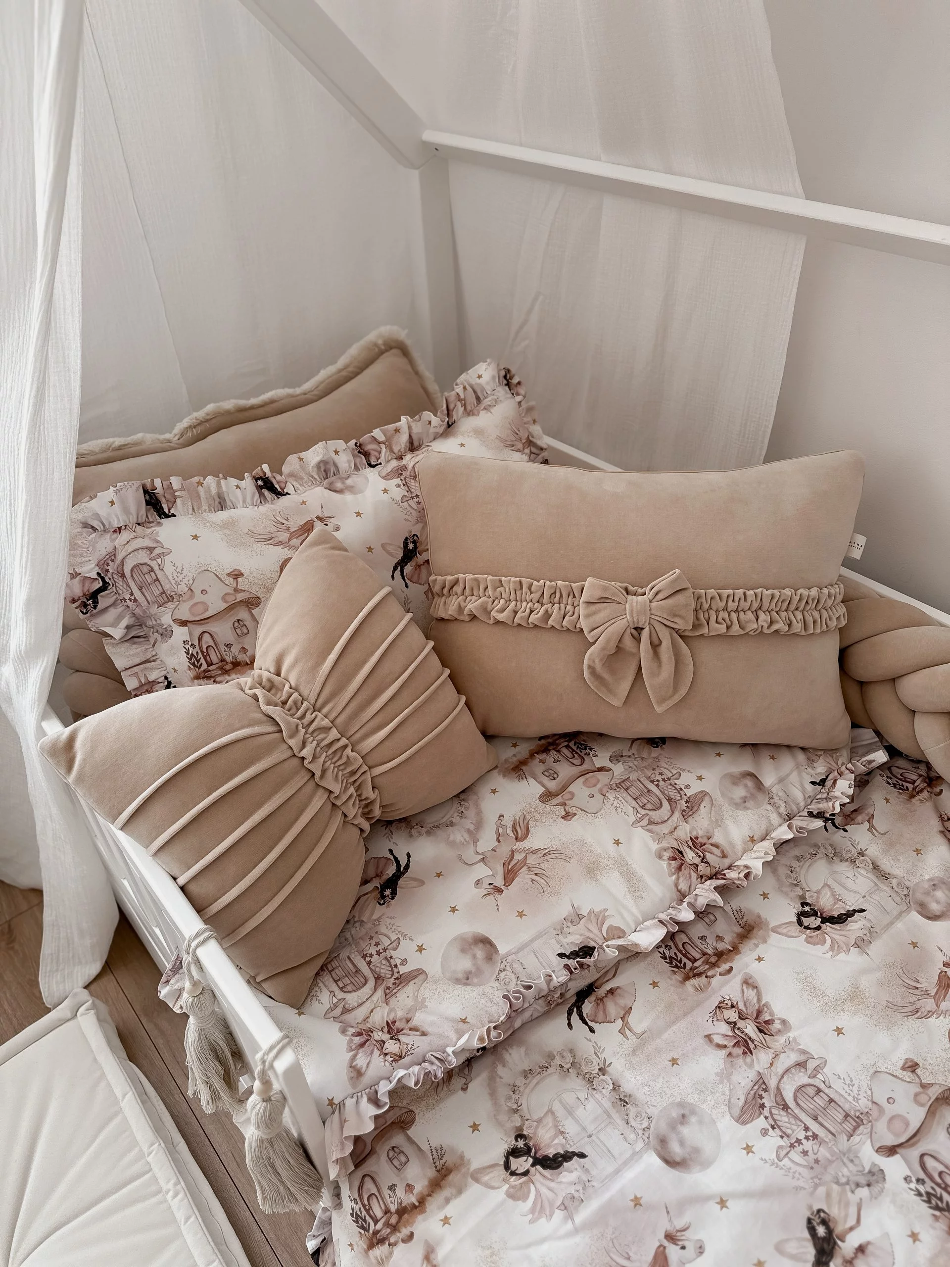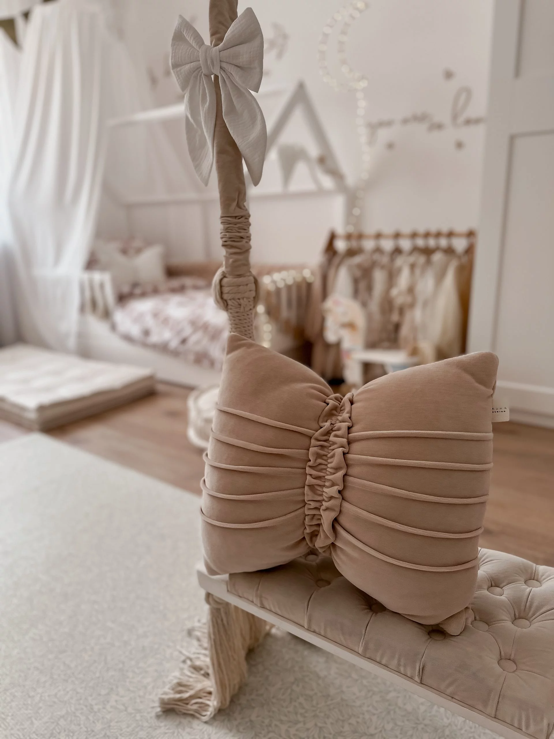 Ein bezauberndes dekoratives Kissen in Form einer Schleife aus weichem Samt. Die Längssteppung sorgt für einen originellen Look und einen schönen Faltenstreifen in der Mitte. Einzigartig und wunderschön. Passt perfekt in Prinzessinnenzimmer. Das Kissen wird in einer Farbe hergestellt. Wenn Sie jedoch davon träumen, zwei Farben zu kombinieren (z. B. ein beiges Kissen und einen cremefarbenen Streifen), teilen Sie uns dies bei der Bestellung in den Kommentaren mit.