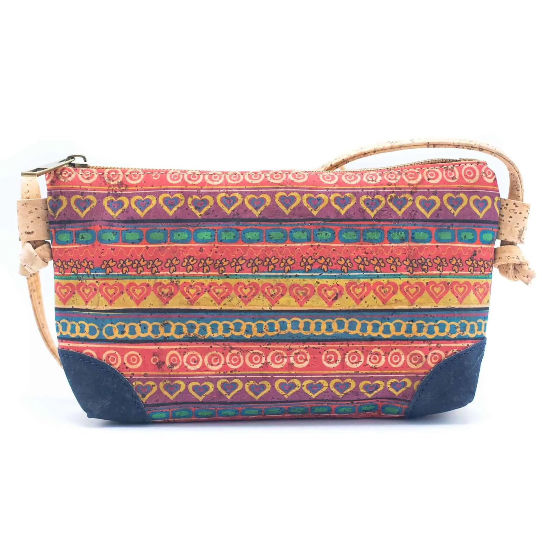 Eine strukturierte Korkhandtasche mit silbernen Details, einem Korkriemen, einem Reißverschluss und einem schönen Muster.