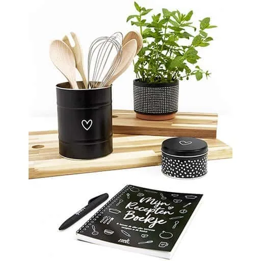 Diese schöne mattschwarze Küchendose ist ein echter Hingucker auf Ihrer Arbeitsplatte. Es hat einen schönen mattschwarzen Look mit einem kleinen weißen Herz darauf. Unten ist das Zoedt Logo in klein. Diese Küchendose ist ideal zum Aufbewahren Ihres großen Bestecks wie Schneebesen, Schöpfkellen, Suppenlöffel etc. Das spart Platz in Ihrer Besteckschublade und sieht auch noch schick aus!