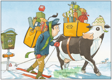 Lieselotte hilft dem Postboten mit der Weihnachtspost – Kuh Lieselotte – TAURUS Kunstkarten