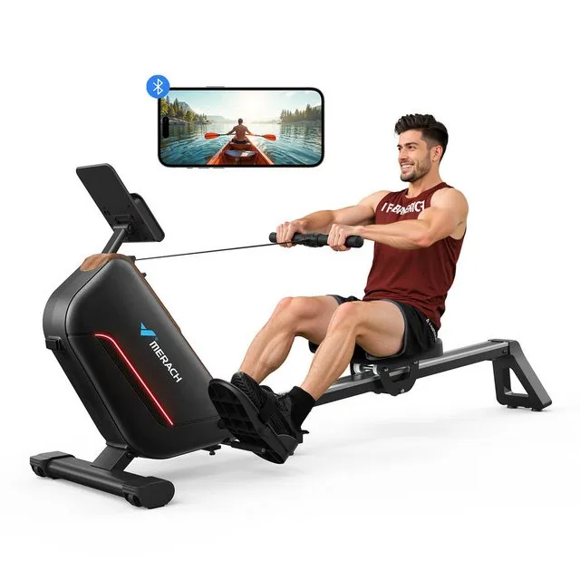 – Starker Magnetwiderstand: Das Magnet-Schwungrad bietet bis zu 40 kg Widerstand mit 16 einstellbaren Stufen für unterschiedliche Trainingsbedürfnisse. – Verlängerte Schiene: Die 130 cm lange Schiene ermöglicht volle Muskelstreckung und kraftvolle Ruderzüge. – Ergonomisches Design: Präzise angepasste Griffposition und Schienenwinkel fördern eine optimale Rudertechnik und verhindern Kollisionen von Ellbogen und Beinen. – Großes Display &, Bluetooth: Der neue, große Bildschirm zeigt Ihre Trainingsdaten klar an. Verbinden Sie Ihr Smartphone per Bluetooth mit der MERACH-App, um Ziele zu setzen, an Wettkämpfen teilzunehmen oder mit interaktiven Szenarien und Spielen zu trainieren. – Einstellbare Gerätehalterung: Platzieren Sie Ihr Smartphone oder Tablet optimal für beste Sicht auf das Display. – Schnelle Montage &, platzsparend: 90 % vormontiert, in nur 20 Minuten einsatzbereit. Die faltbare Schiene und vertikale Aufbewahrung sparen Platz und sorgen für Ordnung zu Hause. ProduktGröße: Aufgeklappte Maße: 1619 × 519 × 722 mm Gefaltete Maße: 722 × 519 × 1619 mm Verpackungsmaße: 950 × 170 × 525 mm Nettogewicht: 21 kg Technische Daten: Widerstandssystem: Magnetwiderstand Widerstandsstufen: 16 Stufen Widerstandsbereich (30 rpm): 40 kg Maximale Belastung: 160 kg