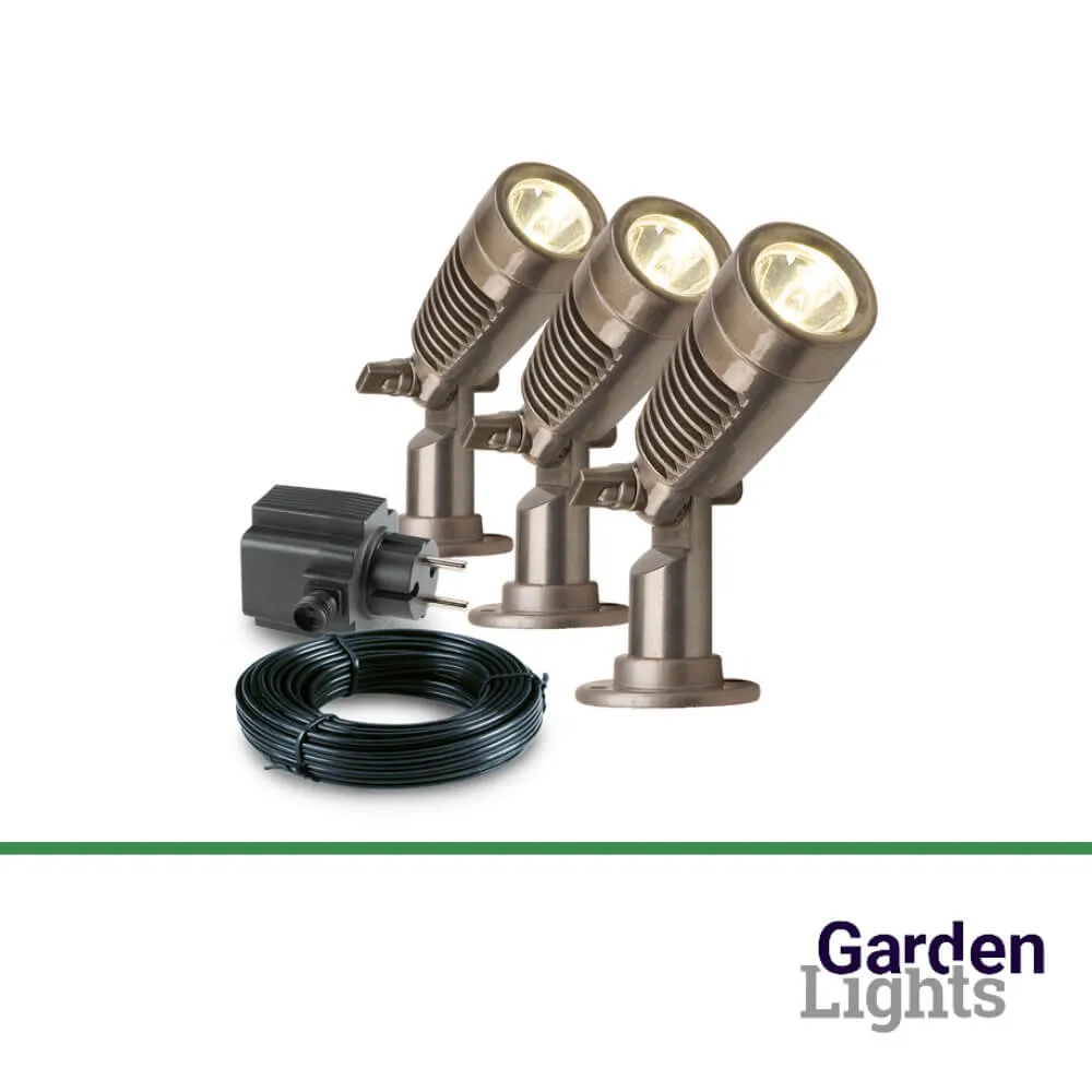 Set bestehend aus 3 Spots, einem 8 Meter langen Hauptkabel und einem 21-W-Transformator. Dieser Power LED-Gartenspot hat einen Verbrauch von 2 Watt, ist sehr leistungsstark und besitzt einen niedrigen Sockel. Die Leuchte eignet sich perfekt, um Pflanzen und Skulpturen ins Rampenlicht zu rücken. Im Lieferumfang dieses Sets sind ein Hauptkabel und ein Transformator enthalten.