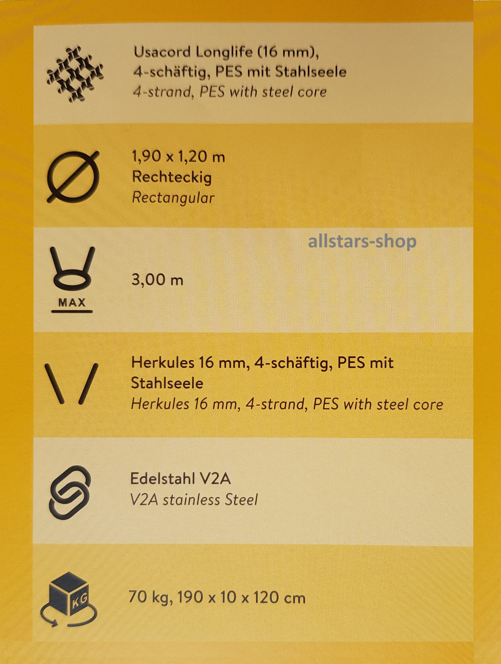- Aufhängeseile: Herkules 16 mm, 4-schäftig, PES mit Stahlseele