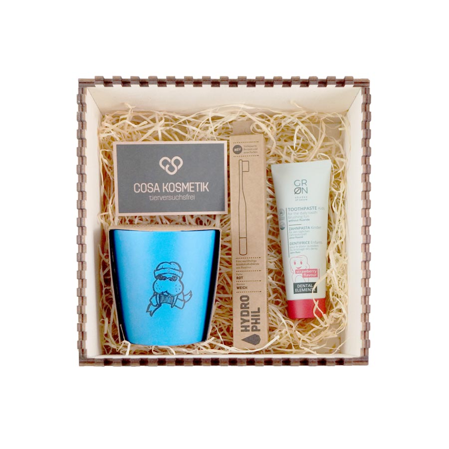 Unsere handgemachte Holzbox eignet sich perfekt, um deine Produkte in einer ganz besonderen Art und Weise zu verschenken. Durch das Motiv, eignet sie sich besonders als Geschenk für Kinder mit beispielsweise einer Bambuszahnbürste für Kinder, einem Zahnputzbecher und einer Zahncreme mit Erdbeergeschmack als Inhalt.