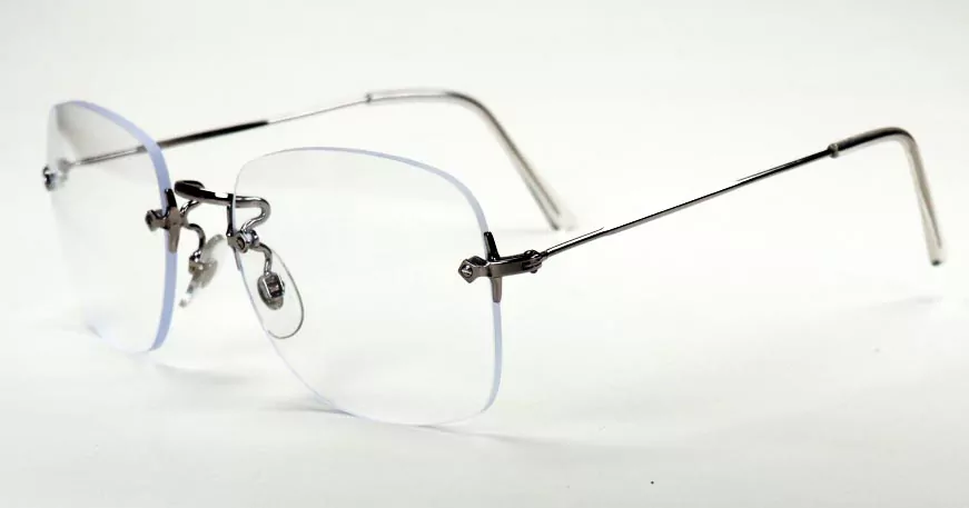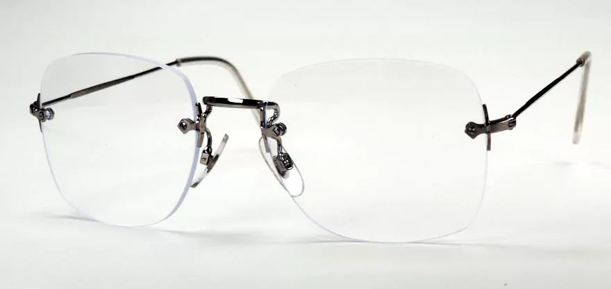Randlose Brille aus den 70er Jahren, silberfarben, große Form und fabrikneu.