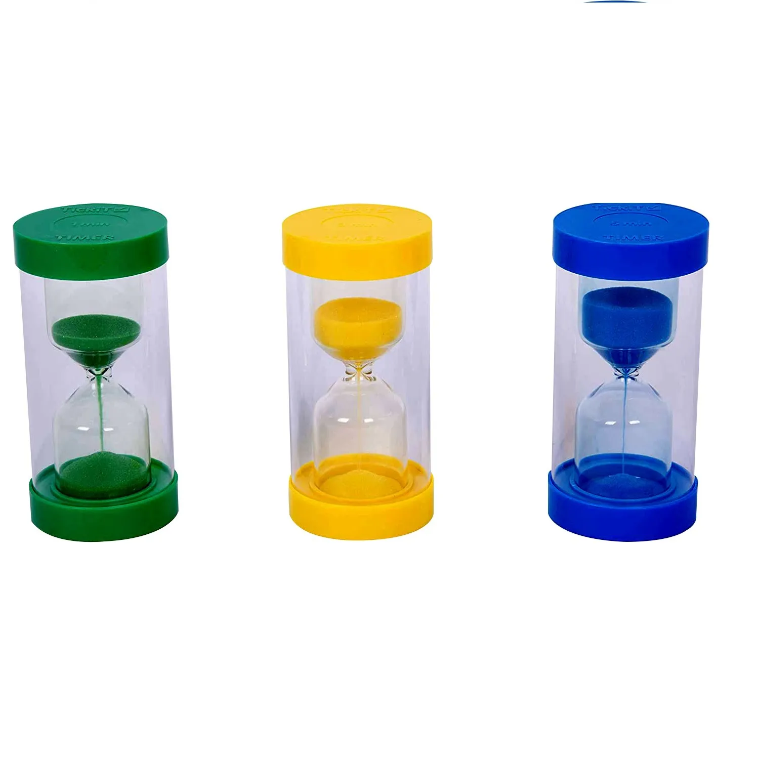 Die Zeiten sind auf jeder Endkappe deutlich weiß angegeben. Diese Sanduhren können einen Schlag vertragen. Sie haben ein abgerundetes Design und bestehen aus unzerbrechlichem Kunststoff, um die Kristallkugel im Inneren zu schützen. Verwenden Sie die Timer, um die Dauer einer Aktivität oder Aufgabe anzuzeigen, oder verwenden Sie sie, um Experimente in Mathematik oder Naturwissenschaften zu messen. Das Set besteht aus 3 Sanduhren: ein Timer von 1, 3 und 5 Minuten.