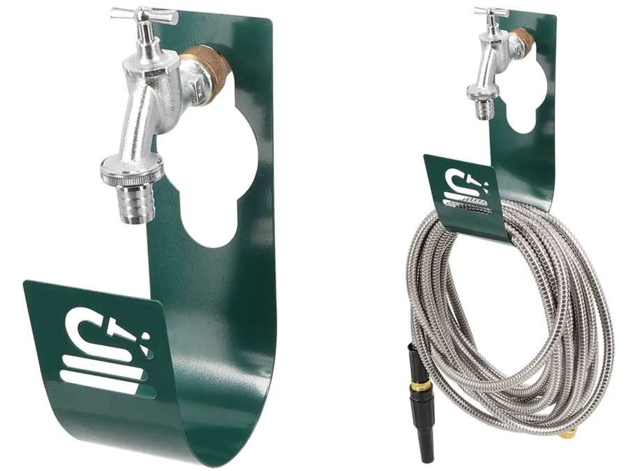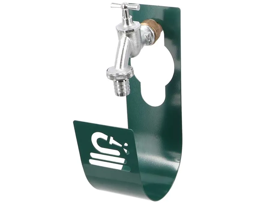 Schlauchhalterung aus grün lackiertem Weichstahl mit lasergraviertem Gartenschlauch-Symbol