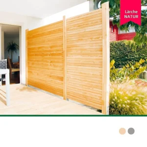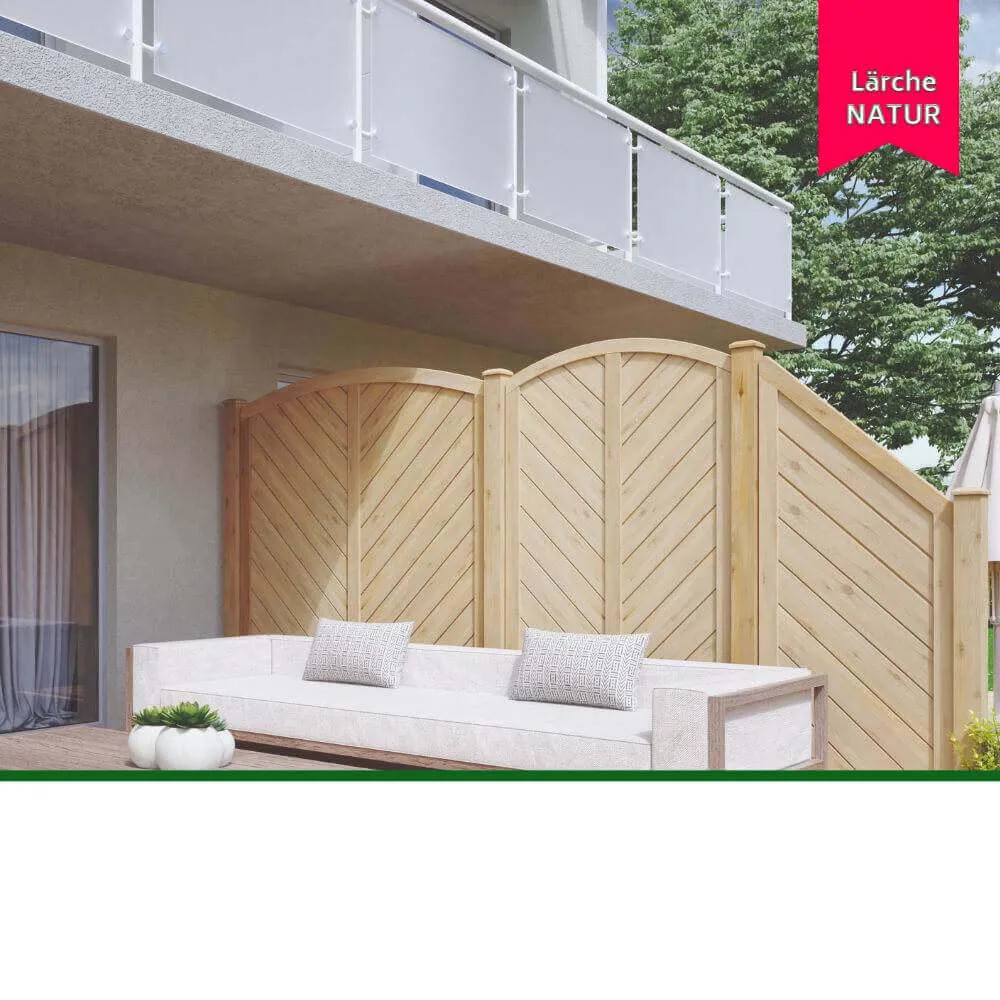 Massive Sichtschutz-Elemente mit Leimholzbogen, die nach solider Handwerkstradition verarbeitet sind. Auffallend massive Rahmen, ca. 42 x 78 mm stark und formschön gerundet, Füllung aus 18 mm starkem