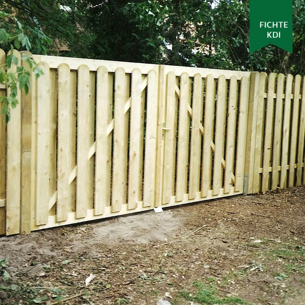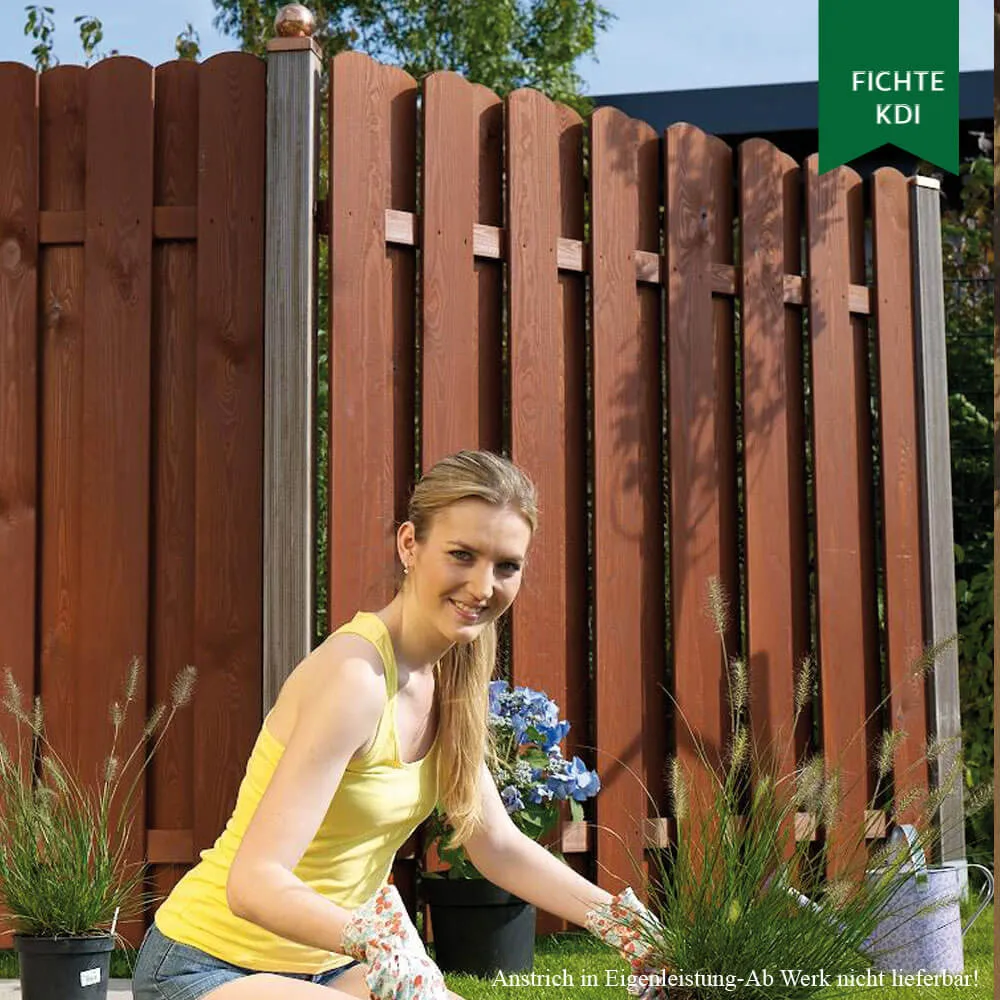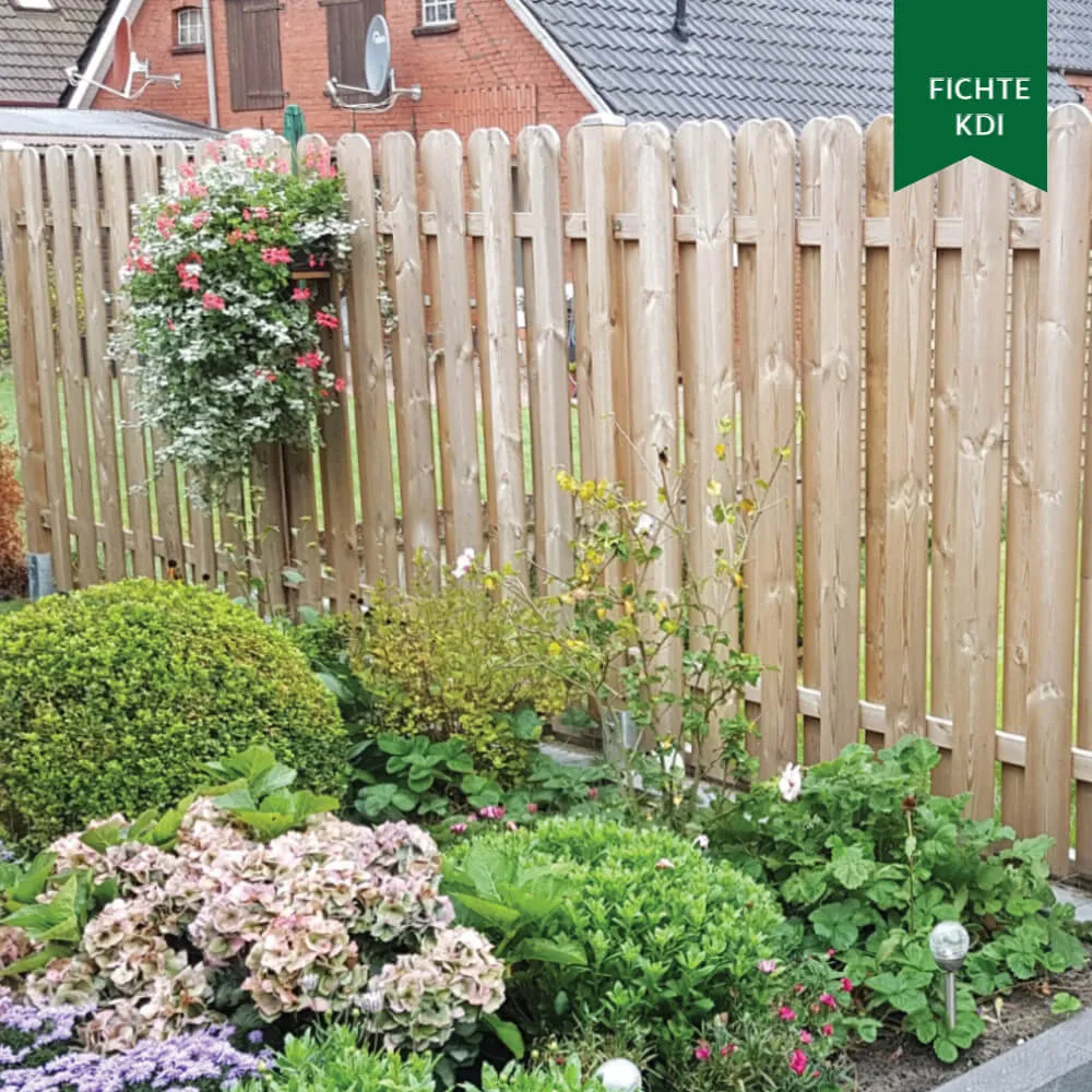 Der Sichtschutz-Klassiker im Garten – gehobelte und gefräste Staketbretter aus kesseldruckimprägnierter nordischer Kiefer werden wechselseitig versetzt zu einem „guten & günstigen“ Sichtschutzzaun verarbeitet. Die einzelnen Bretter werden mit V2A-Schraubnägeln auf dem Querriegel befestigt.