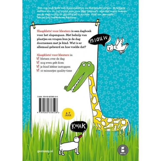 Slaapklets! voor kleuters van Gezinnig is een fijn boek om voor het slapengaan de dag door te nemen en even de volle aandacht van mama of papa te krijgen. Het is goed voor kinderen om de dag te laten bezinken en fijn voor ouders om een kijkje te krijgen in het hoofd van hun kind. Samen napraten over belevenissen en gevoelens en nog even spelen voordat de nacht begint. Het helpt de indrukken van de dag te verwerken en bevordert een betere en meer ontspannen nachtrust. [Lees hier meer tips voor betere nachtrust].