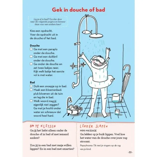 - De rechterpagina is steeds anders: een kort spelletje, een of twee kletsvragen en een rustige afsluiter, zoals minimassages.