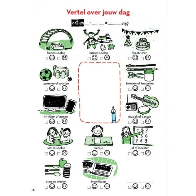 - Iedere linkerpagina bevat dezelfde dagboekplaatjes: kies een of meer situaties en laat je kind vertellen. ‚Heb je vandaag gedanst? Buiten gespeeld of een werkje gedaan? Werd je daar blij van, of misschien verdrietig of boos?‘