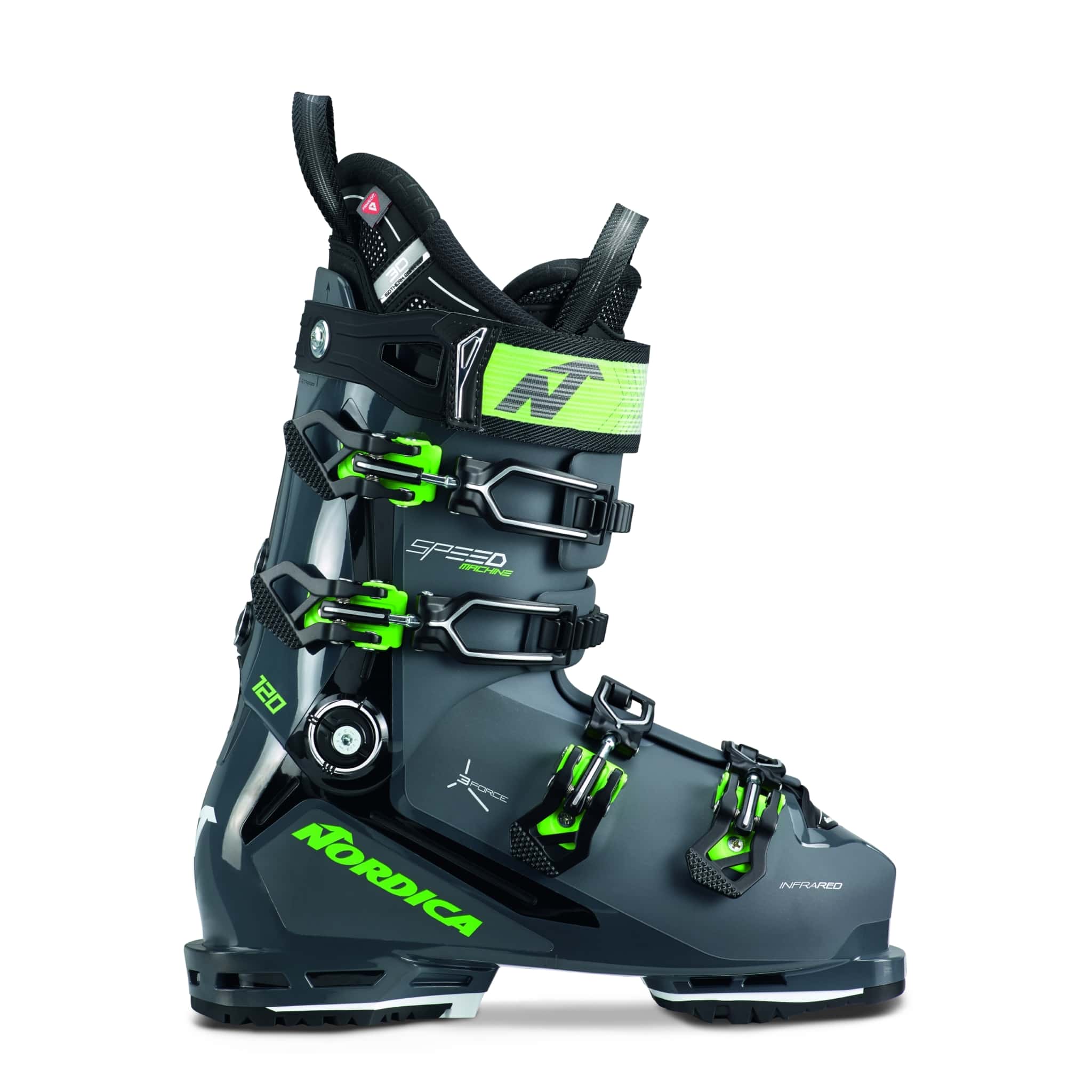 Der innovative Nordica Speedmachine 3 120 kennt keine Limits. Er ist der perfekte Skischuh, mit dem du das gesamte Skigebiet erkunden kannst. Die Erfahrung mehrerer Jahrzehnte ist in die Entwicklung mit eingeflossen. Das zeigt sich in der bisher unerreichten Performance und dem sensationellen Komfort. Für einen verbesserten Halt sowie eine höhere laterale Impulsübertragung, ist der Innenschuh mit 3 Force EVA-Einsätzen ausgestattet. Bei Bedarf, kann selbstverständlich die Schale durch das patentierte InfraRed Verfahren, der Innenschuh im Wärmeofen und die Schnallen individuell angepasst werden. Egal in welchem Terrain du unterwegs bist – der Nordica Speedmachine 3 120 gibt dir ein gutes Gefühl.