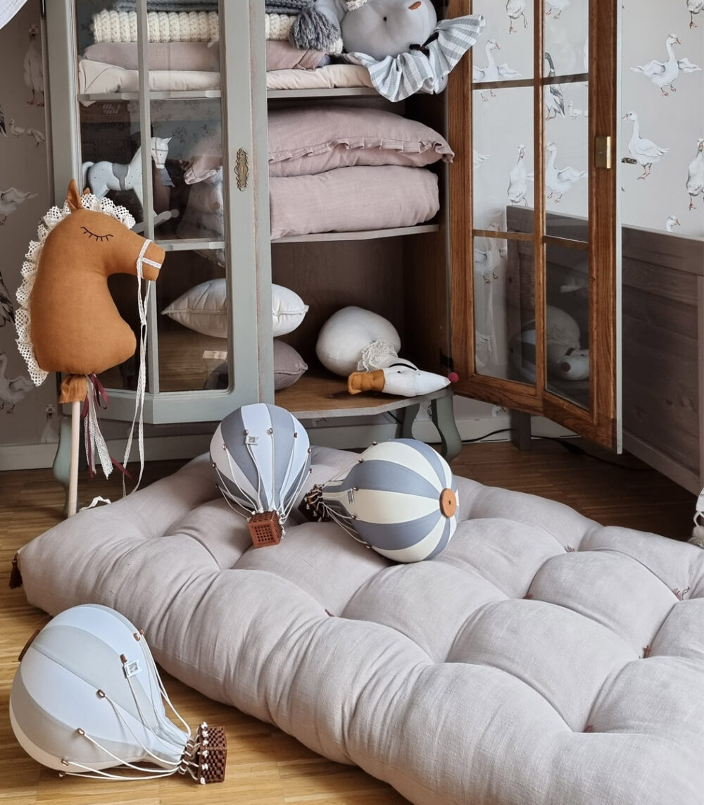 Handgepolsterte Matratze aus taupefarbenem Stoff. Es ist gefüllt mit einer antiallergischen Silikonkugel, die mit braunen Quasten verziert ist. The matratze is a großartiger Ort für Kinder zum Spielen und Relaxen. It is possible to order a matratze with the correct mass for the tipi from our sortiment. Produktmaße: 110/70/10 Ersatz: Stoff 30% Leinen, 70% Viskose Füllung: Silikonkugel