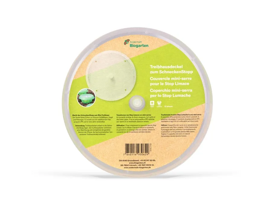 Wenn du deine Jungpflanzen wie Salat oder Kohl mit dem SchneckenStopp Schutzring vor gefräßigen Kriechtieren schützt, kannst du mit diesen Treibhausdeckeln zusätzlich einen deutlichen Erntevorsprung gerade im Frühjahr und Herbst erreichen: Mit aufgesetztem Deckel wir der SchneckenStopp zum Mini-Treibhaus!