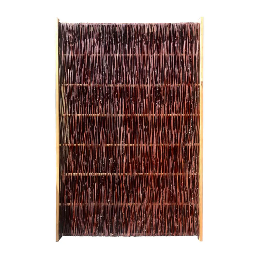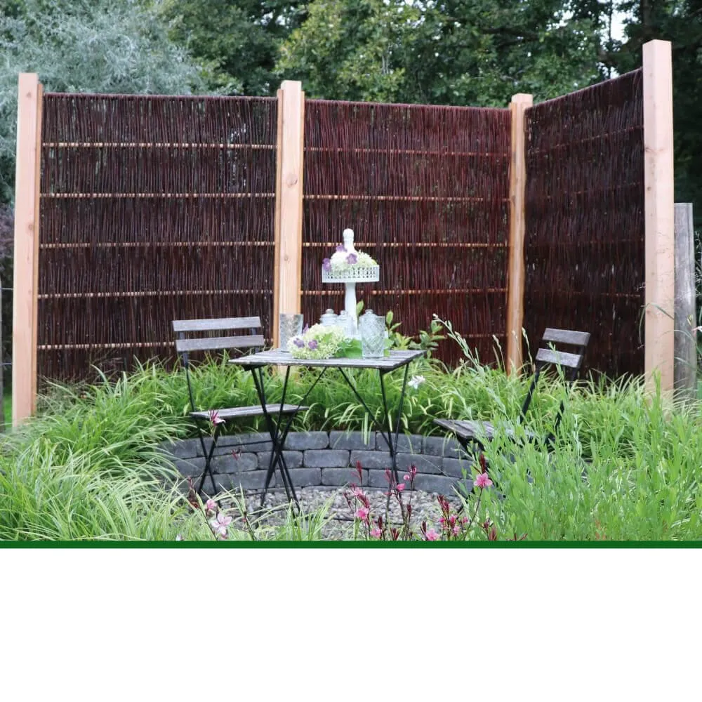 Weidenzaun mit Seitenrahmen, lasierte Kiefer 24 x 48 mm. Füllung aus 3-10 mm Ruten, geflochten aus ungeschälter Weide, fungizid- und ölbehandelt.