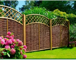 Weidenzaun mit Komplettrahmen, lasierte Kiefer 35 x 45 mm. Füllung und Ziergitter aus ungeschälter Weide, fungizid- und ölbehandelt.