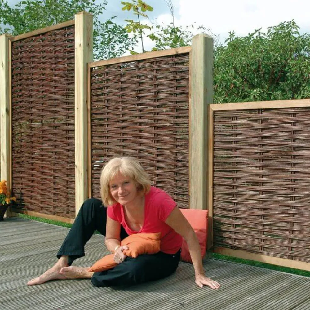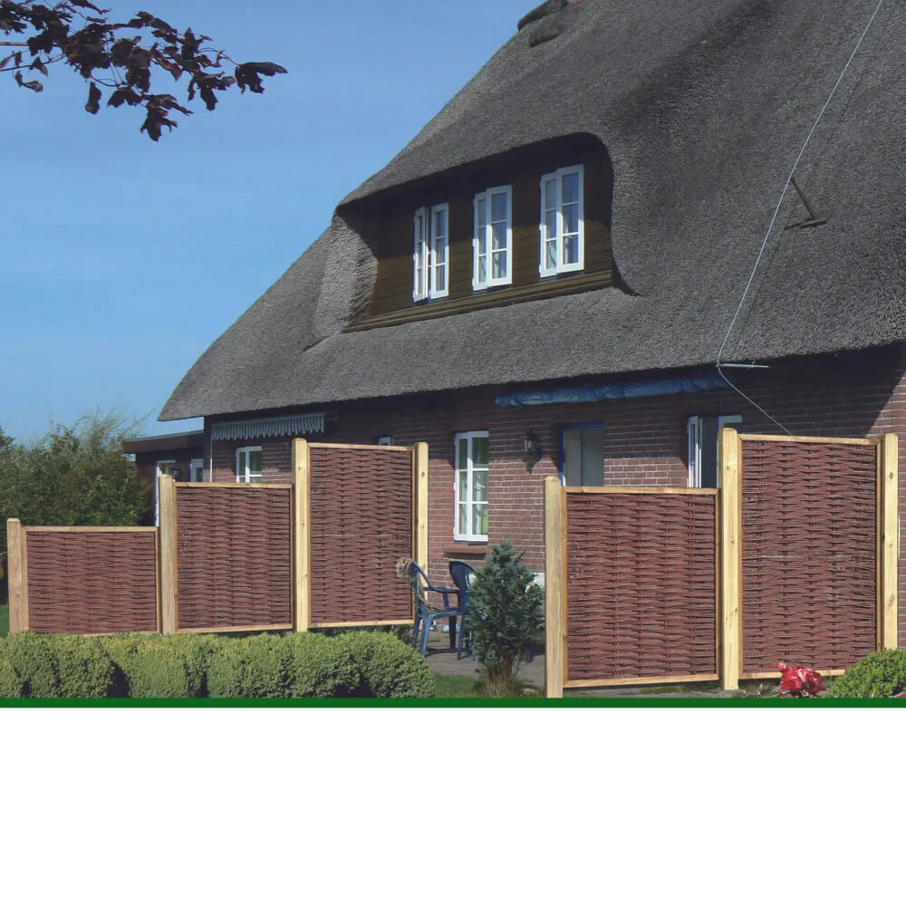 Gerade Sichtschutzlemente mit naturnaher Ästhetik: Die funktional-schönen Weidezäune Holm zeigt einen ursprünglichen Charme, passt nicht nur den Naturgarten. Das im geraden Rahmen platzierte Rutengeflecht aus der Weide wird gemäß alter handwerklicher Tradition von von Hand gefertigt.