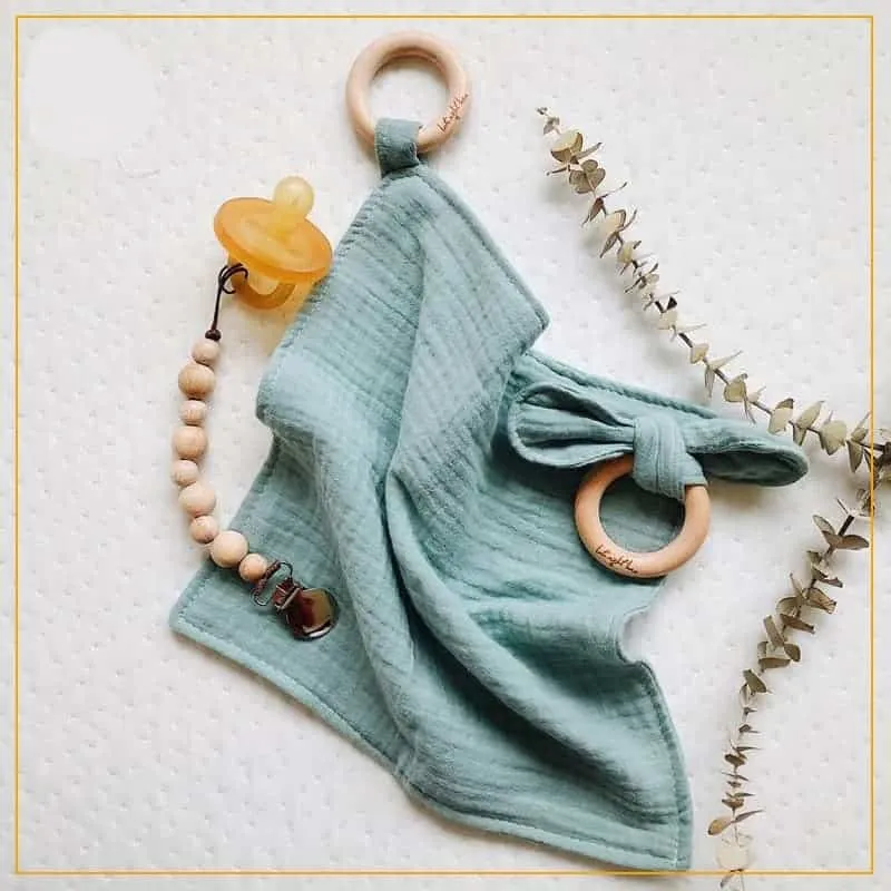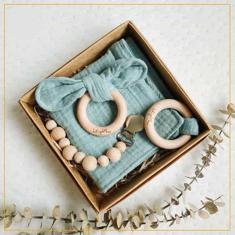 In dem Set sind eine Schnullerkette, zwei Beißringe und ein wunderbar weiches Schmusetuch enthalten. Außerdem ist in unserem Geschenkset eine tolle Schnullerkette mit wunderbaren Holzperlen enthalten. Mit Hilfe der Clips kannst Du dann den Schnuller sichern und Dein Baby hat eine weitere tolle Möglichkeit, seinen Tast- und Greifsinn zu entdecken. Zudem gibt es einen kleinen Knisterspaß, der dem Baby mit Sicherheit viel Freude bereitet. Bei der Herstellung haben wir ein besonderes Augenmerk auf die Verwendung hochwertiger Materialen gelegt. So sind die Stoffe aus 100% ökologischer Baumwolle hergestellt und die Holzmaterialien sind frei von BPA und anderen Zusatzstoffen. Naturprodukte, nachhaltig, in wunderschöner Optik und in Kombination mit fantastischem Spielspaß. Die tollen Vorteile kurz zusammengefasst: