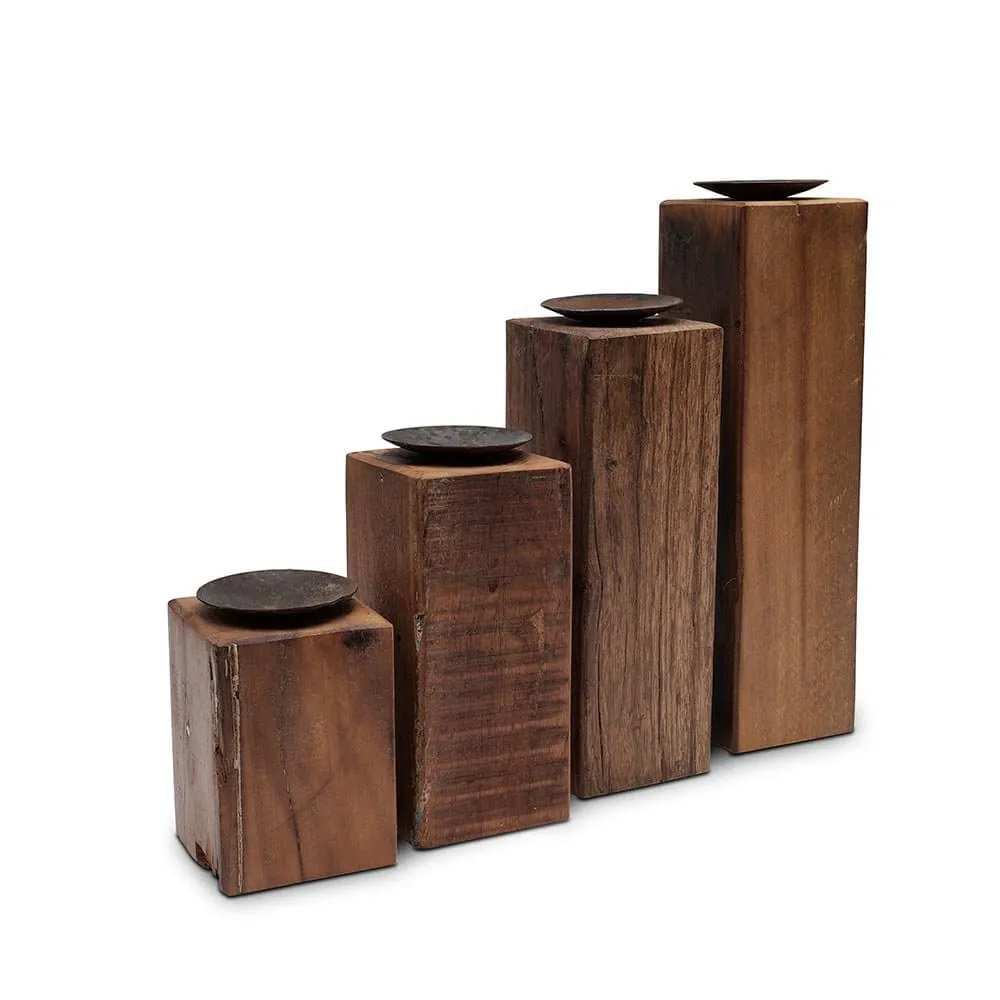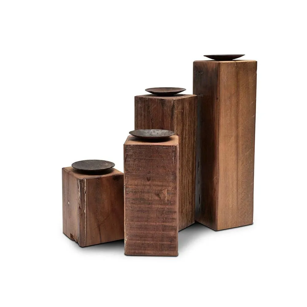 Die Wiladu Kerzenständer Pali sind aus recyceltem Holz gefertigt, was nicht nur die Umwelt schont, sondern auch jedem Stück einen einzigartigen Charakter verleiht. Jedes Set besteht aus vier Kerzenständern in verschiedenen Höhen (10 cm, 15 cm, 20 cm und 25 cm), die eine harmonische und dennoch abwechslungsreiche Dekoration ermöglichen. Die Breite und Tiefe der Kerzenständer beträgt jeweils 7 cm, was sie stabil und standfest macht.