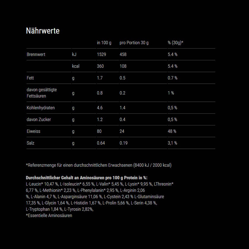 Molkenproteinisolat (89,3 %), stark entöltes Kakaopulver (6,5 %),Aroma, Trennmittel Siliciumdioxid, Süssungsmittel Natriumcycl