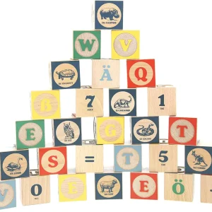 ABC Holzbausteine mit Stofftasche 28 große ABC Bauklötze Bausteine Buchstaben Zahlen Tierbilder